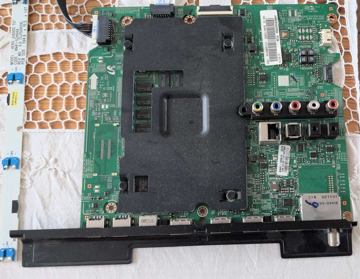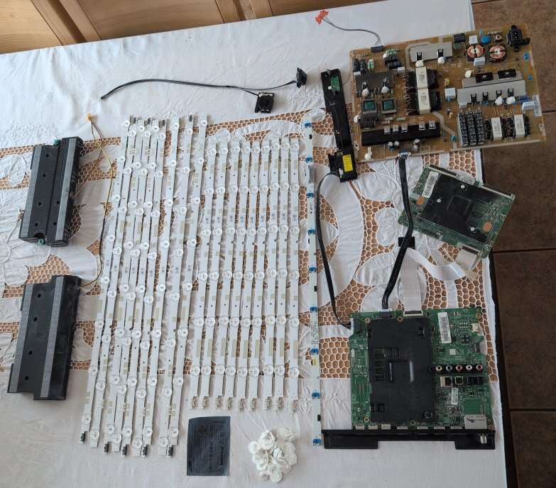 All electronic parts including the motherboard, t-con board, ribbon cables, power supply board, power and control button d, infrared receiver, LED backlight strips, speakers and LCD panel separators. The parts were extracted from a fully functional Samsung 55 inch ultra HD TV Model number UN55js700dfxza with a broken LCD panel (see pictures). Everything worked before disassembly. Motherboard alone is selling for $46 on eBay, and backlight strips are selling for $25-30. I am selling the entire set for $30. It is a very good deal.
