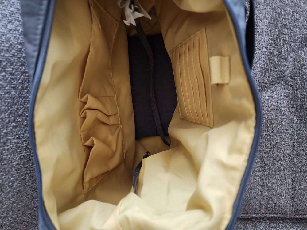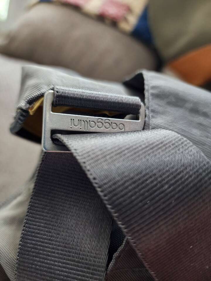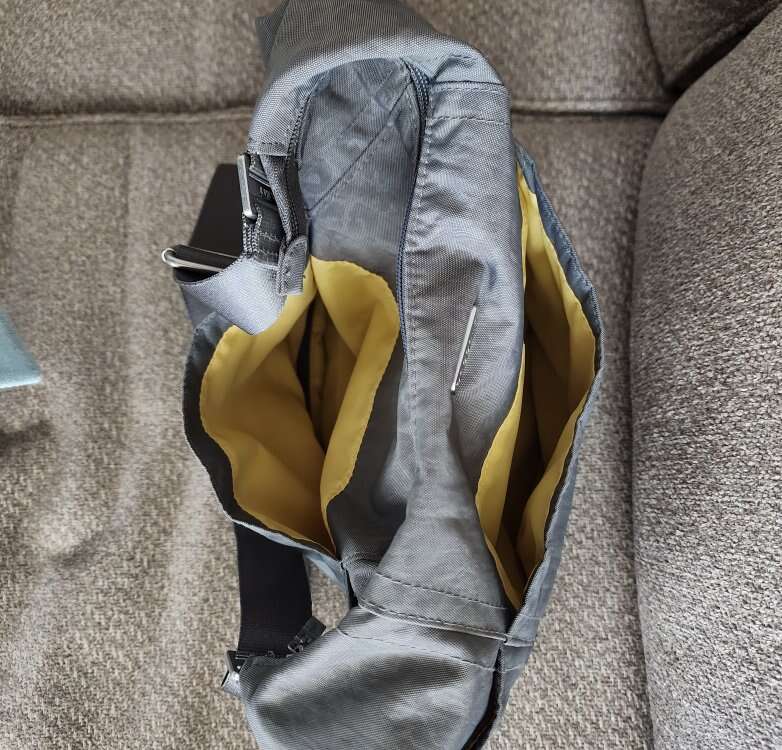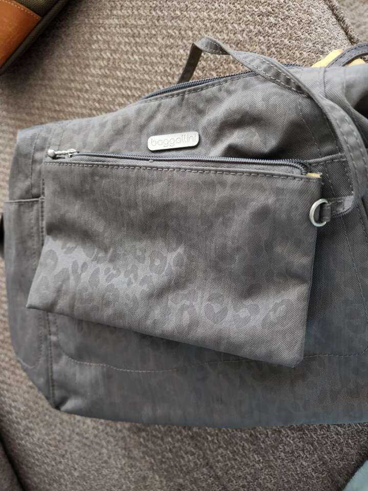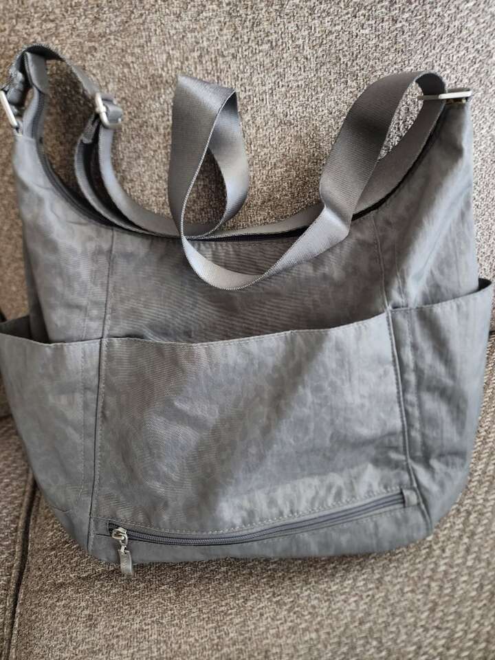 lightweight gray nylon water resistant travel purse with multiple pockets and removable wristlet (rfid) strap length 41.25" adjustable to shoulder length or crossbody. interior has 5 card slots lipstick holder and key leash.3 exterior pockets and convertible back pocket to slide on suitcase handle. appx. 11" x 10" x 5"
