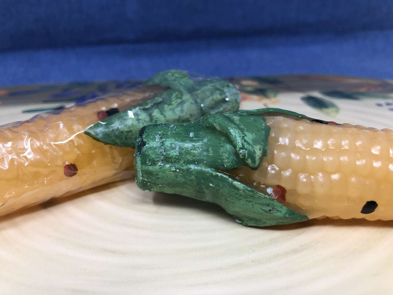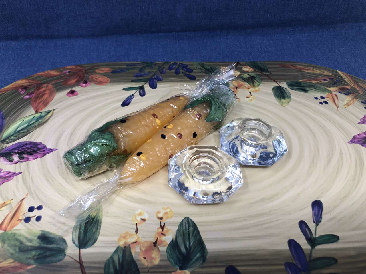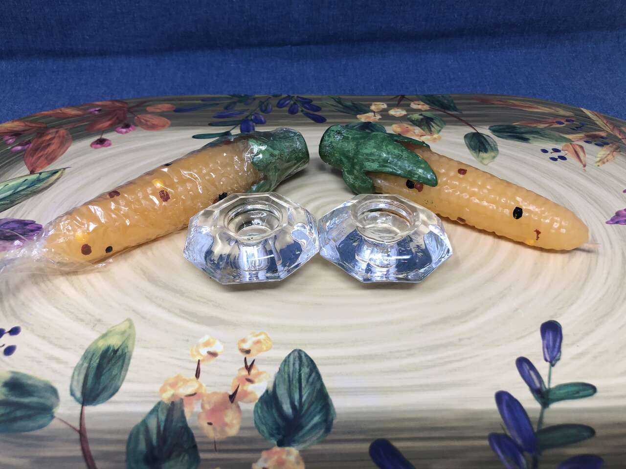 VenmoBe uniquely you with these fantastic NEVER used ALL WAX corn on the cob candles. Talk about PERFECT for your Thanksgiving celebration. The plastic has only been removed for photos. Each red, yellow, and black kernel was hand painted. Both cobs fit beautifully in their glass bases. 12 for both. Measurements: 6 from top to bottom when in the candle holder. Candle is 5' tall and the bases are 2 1/4 wide.