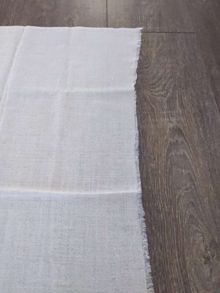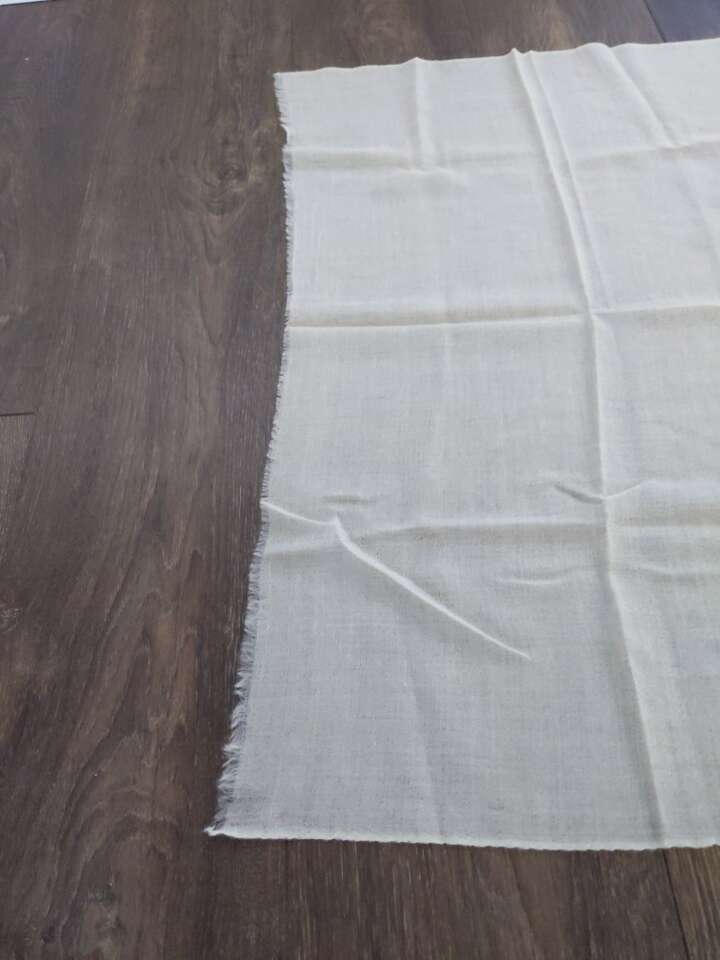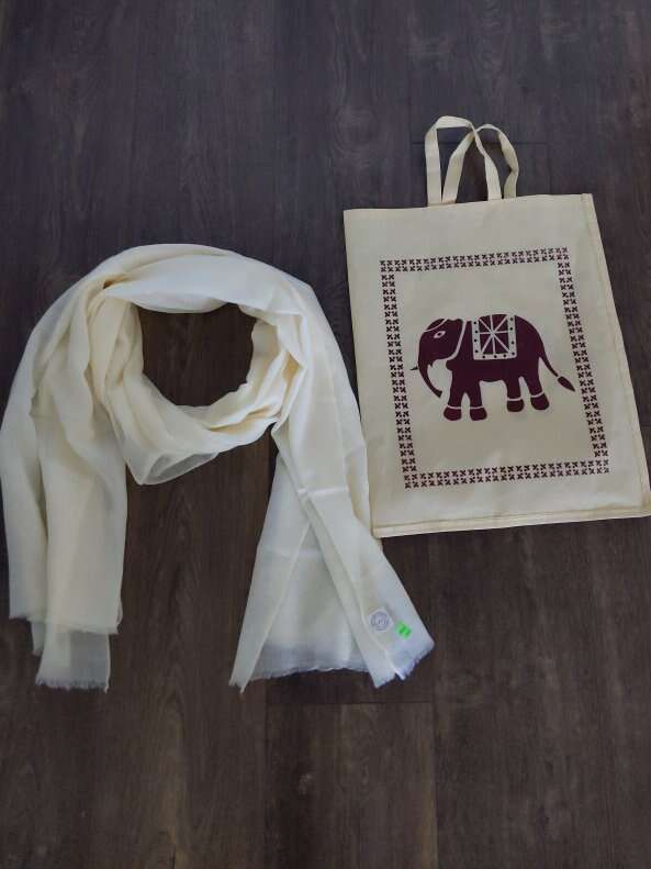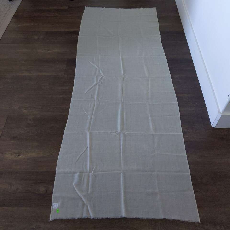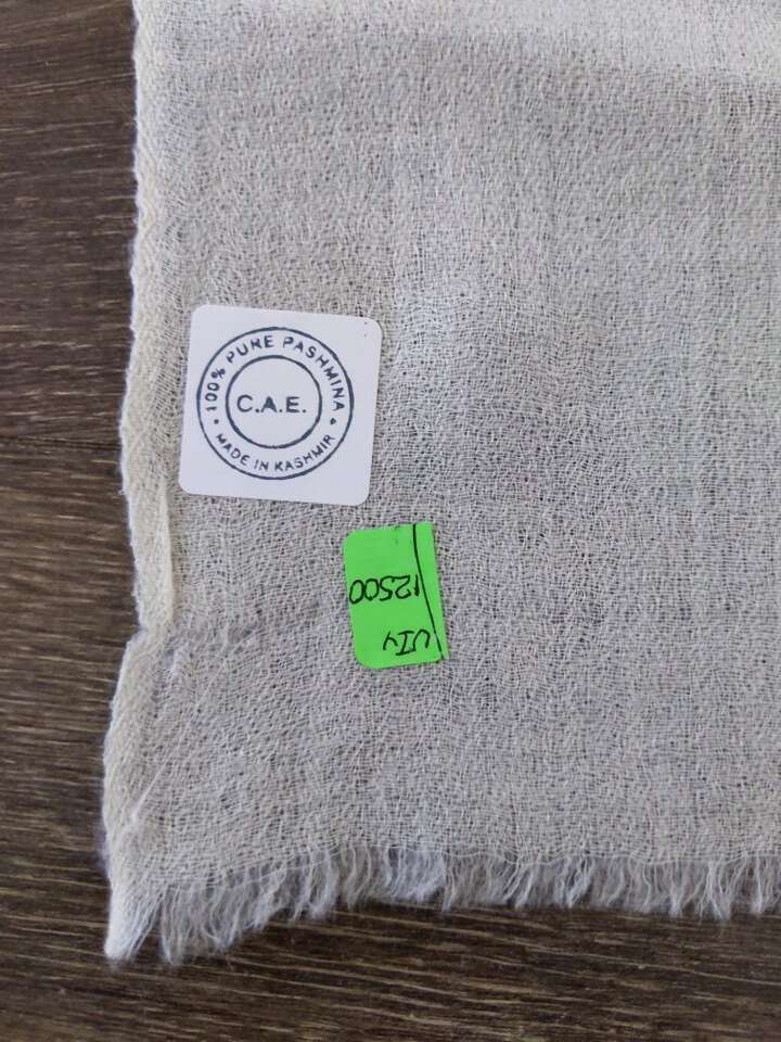 This is a 100% Pure Pashmina Made in Kashmir scarf. It is a beautiful off-white color, so soft, lightweight, and unique. My husband purchased it in India. It is large 78" x 29". Comes with the bag pictured!