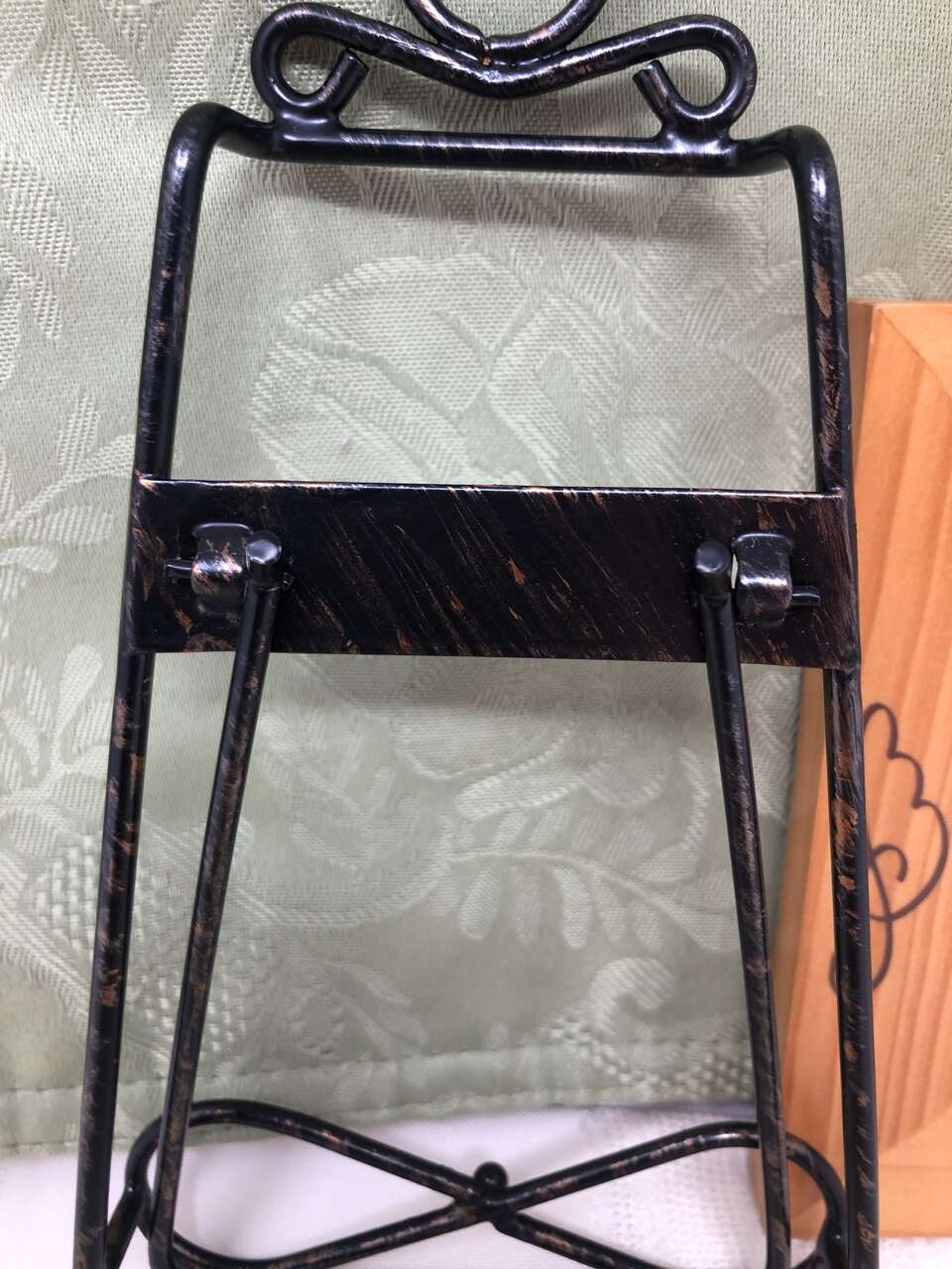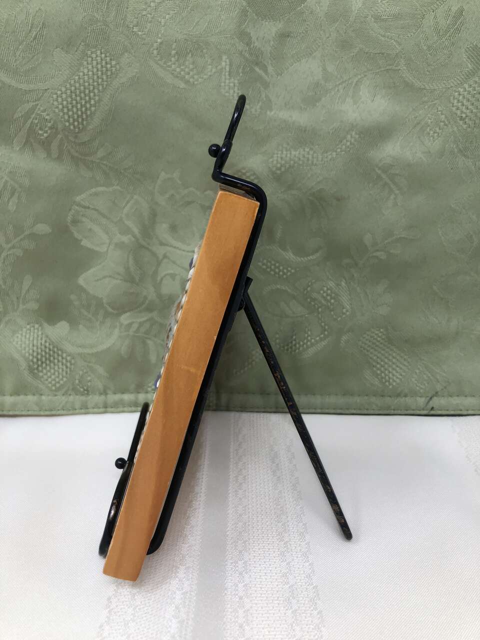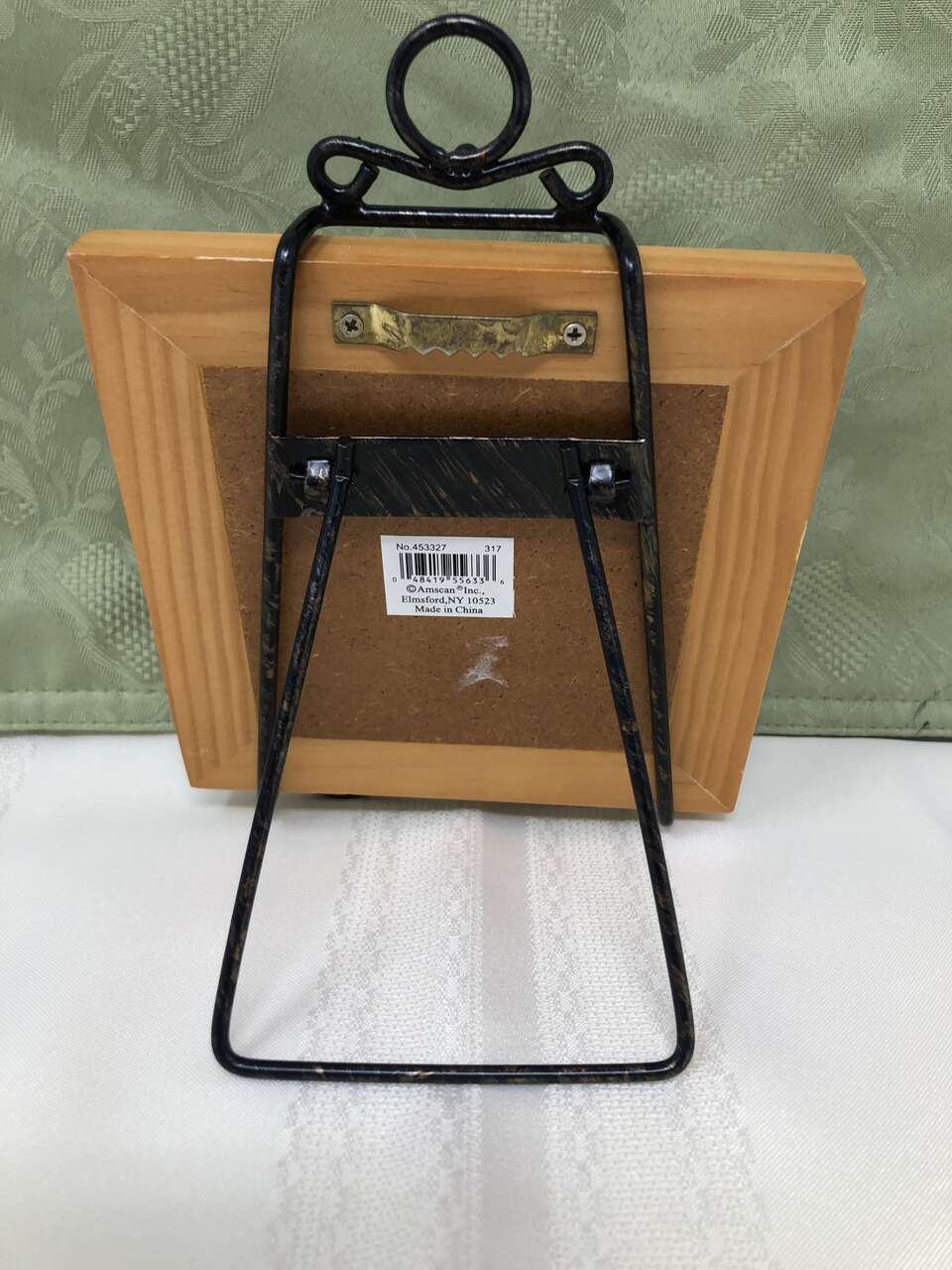 VenmoThis unique piece has a ceramic center with a gorgeous wooden frame to surround it. The black infinity stand has beautiful golden streaks throughout to frame this gorgeous piece. You can either let it sit on it's stand, or it has a picture hanger on the back if you'd rather hang it! Both pieces together measure 7x5x2. The stand alone measure 7x4x4 when fully extended.