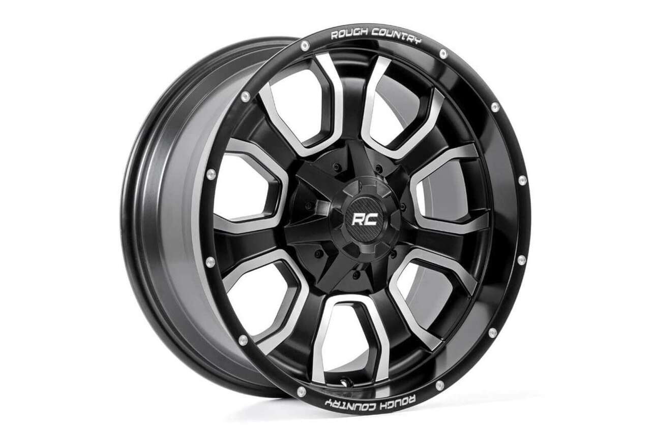 ZelleNew in box Rough Country One-Piece Series 93 Black Wheel w/Milled Accents fits 20X10 (6X5.5 / 6X135) -93201012 Painted and Test Mounting Tires (20 x 10. inches /6 x 5 inches, -18 inches Offset) 7 Spoke Design w/ Milled Aluminum Accents. Single Piece Aluminum Construction. RC Carbon Fiber Center Cap. Gloss Black Coat w/ Machined Accents.