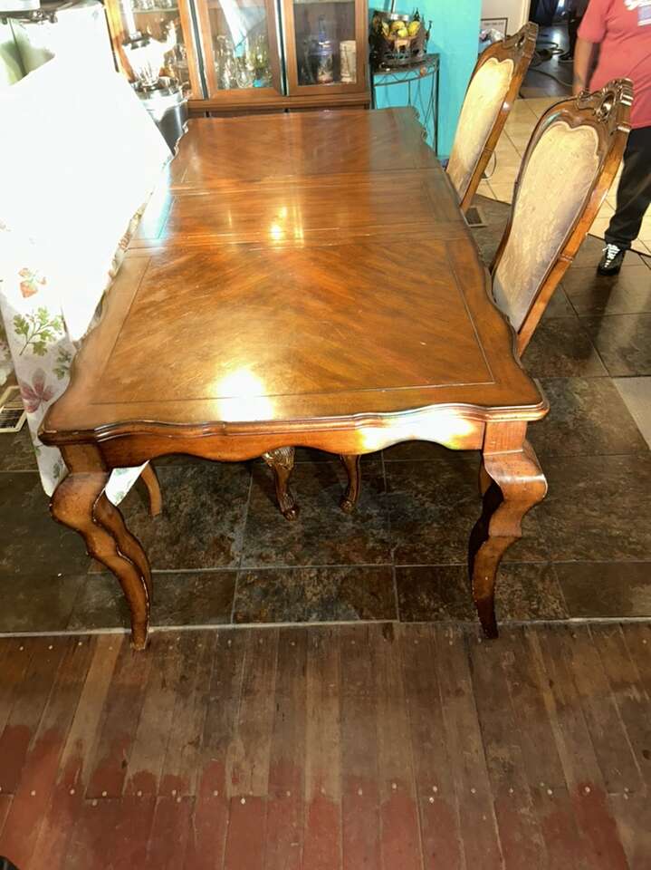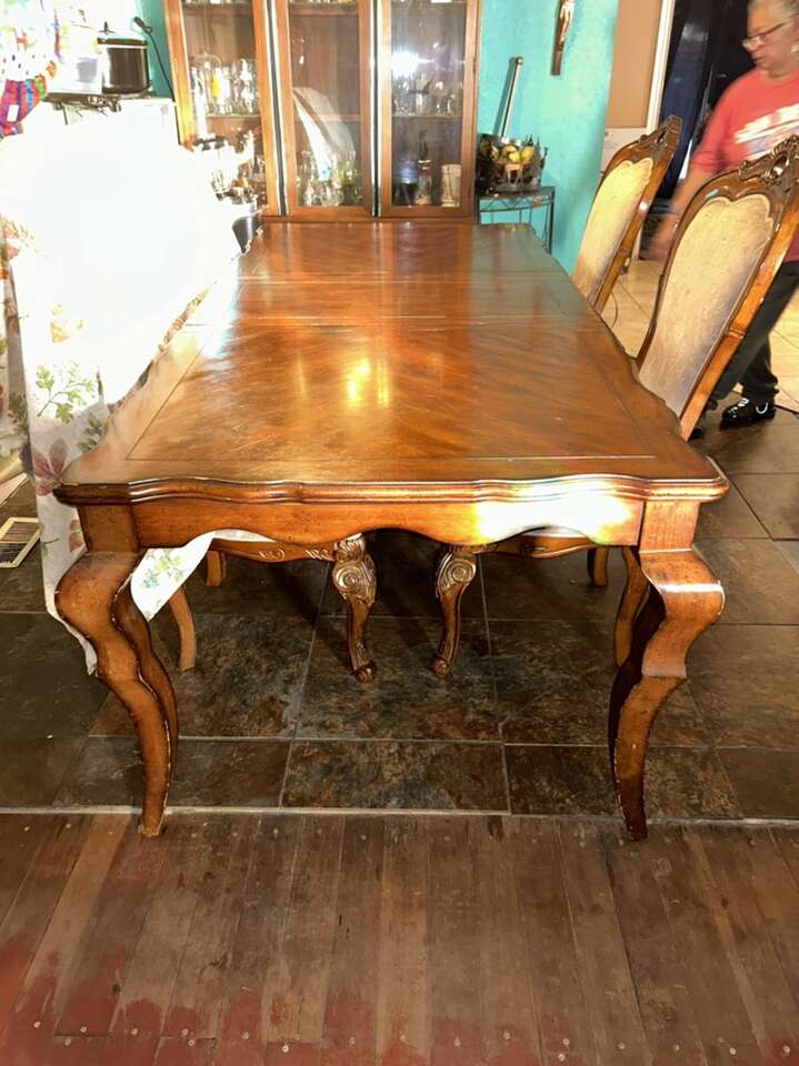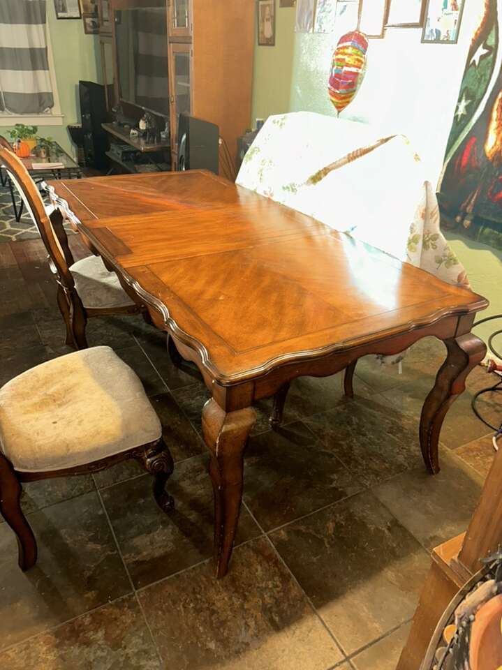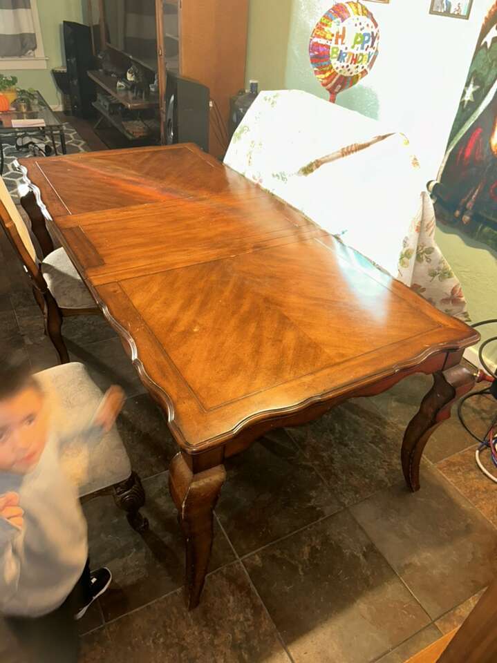 CashAppVery nice solid wood dinner table very sturdy 6 sitter asking $80 middle wood comes off to make it shorter table great looking table heavy duty great deal