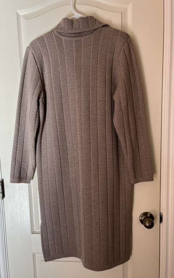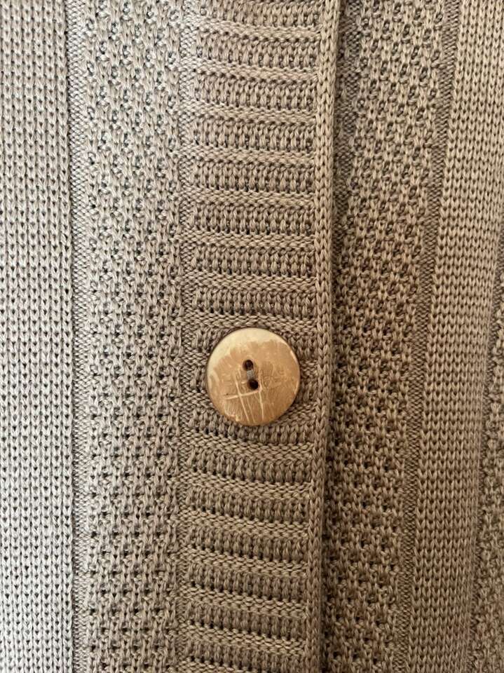 VenmoNever worn tan-grey knitted long cardigan/ coat, Sz L. Elegant design, Large front pockets, big buttons make it an outfit for any/multiple occasions. $25