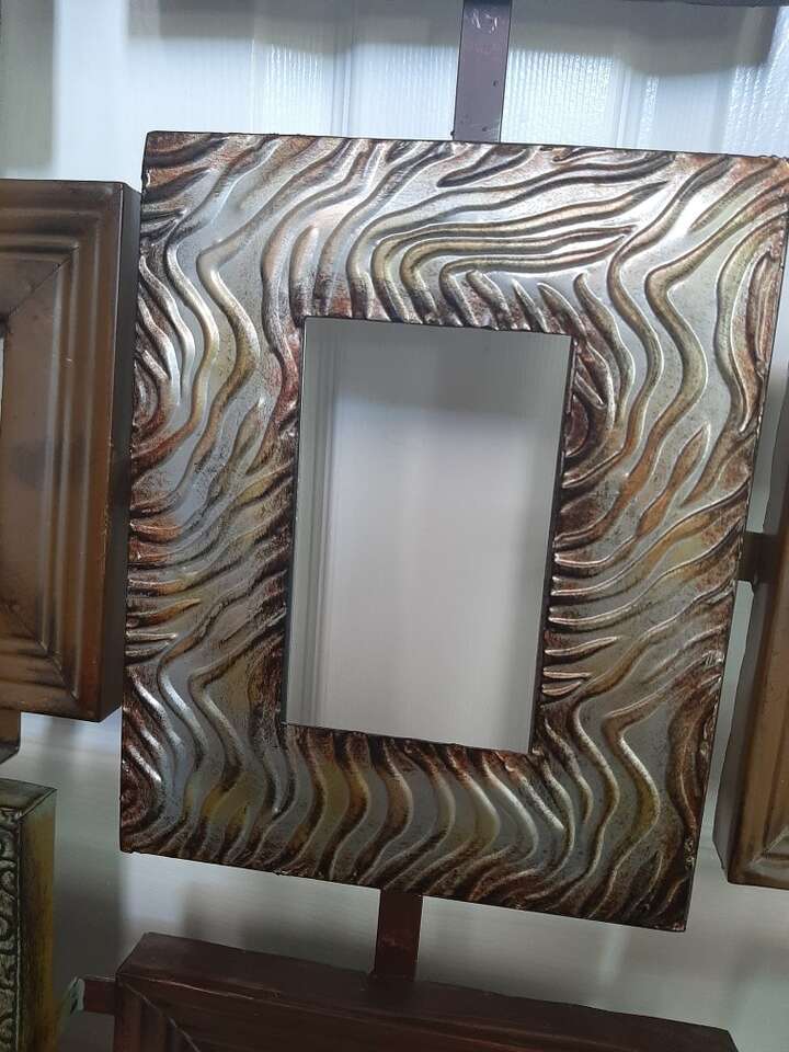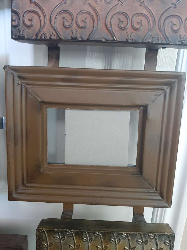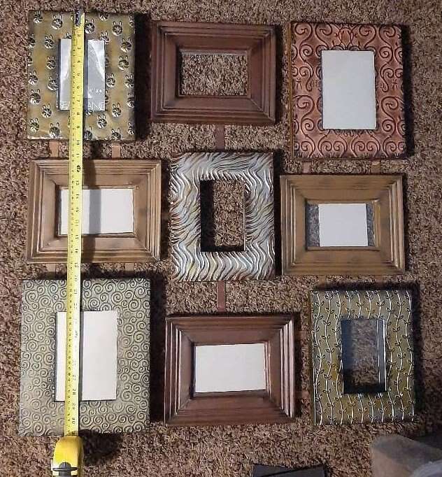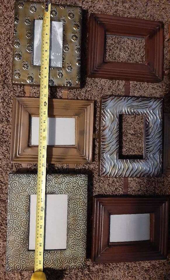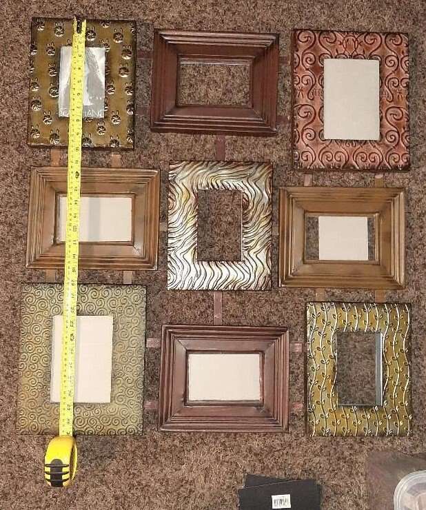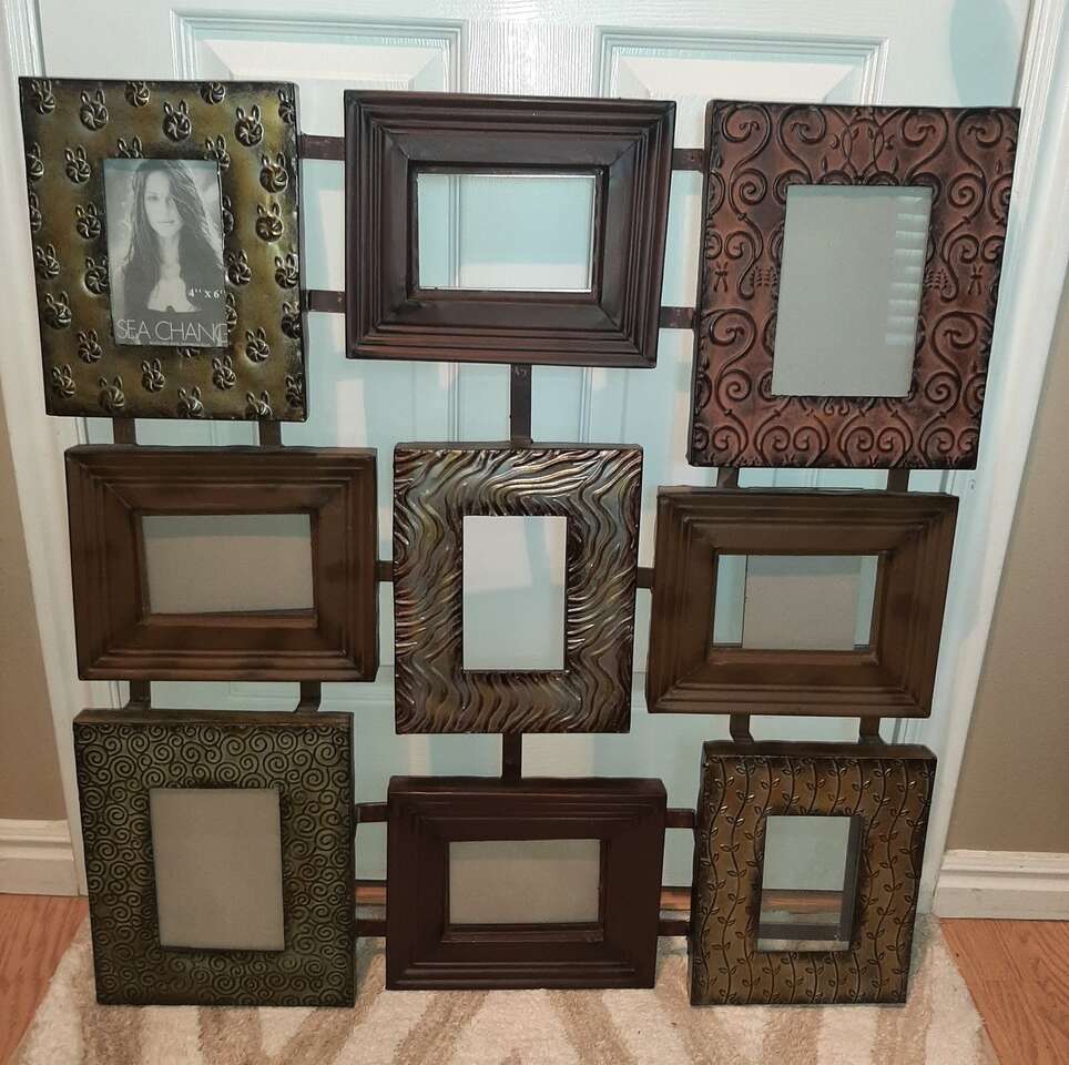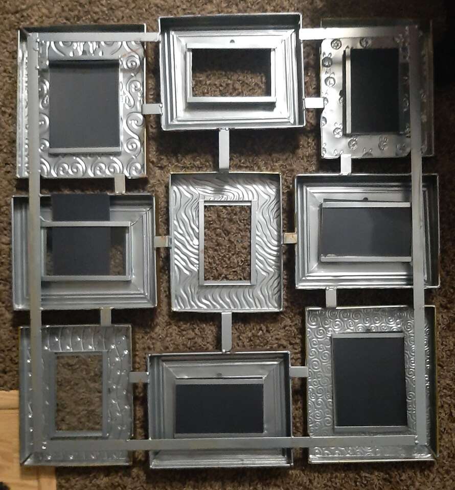 Unique and large wall multiple photo picture frame. Can hold 9 different photos. Each frame measures about 8x10 and holds a 4x6 inch photo. Made from metal, each frame is a different variety texture, pattern, color. Measures about 31 inches total all together. Has all the glass pieces and cardboard backers but I can't seem to get them back in their spots. Hopefully someone with more patience will be able to do it. Smoke free environment.