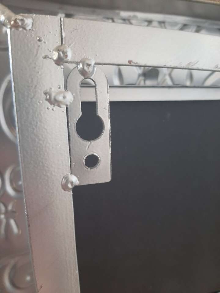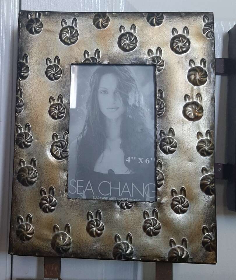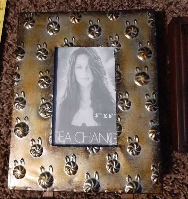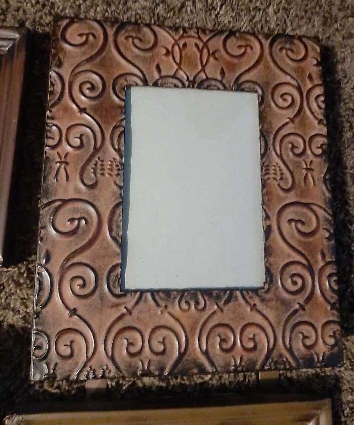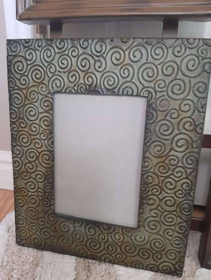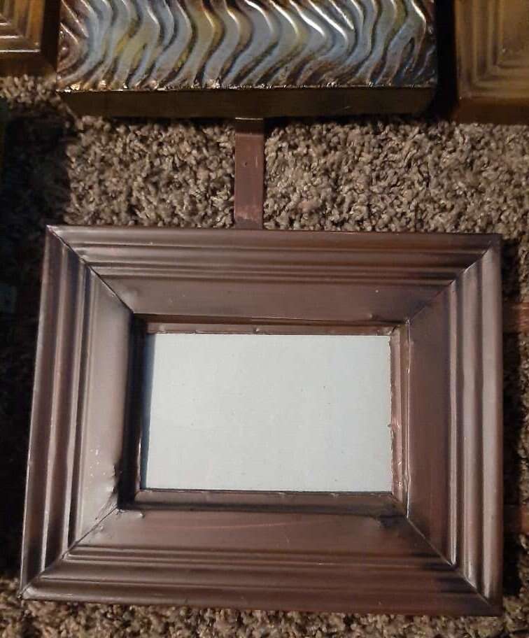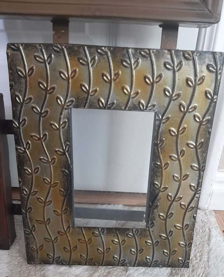 Unique and large wall multiple photo picture frame. Can hold 9 different photos. Each frame measures about 8x10 and holds a 4x6 inch photo. Made from metal, each frame is a different variety texture, pattern, color. Measures about 31 inches total all together. Has all the glass pieces and cardboard backers but I can't seem to get them back in their spots. Hopefully someone with more patience will be able to do it. Smoke free environment.