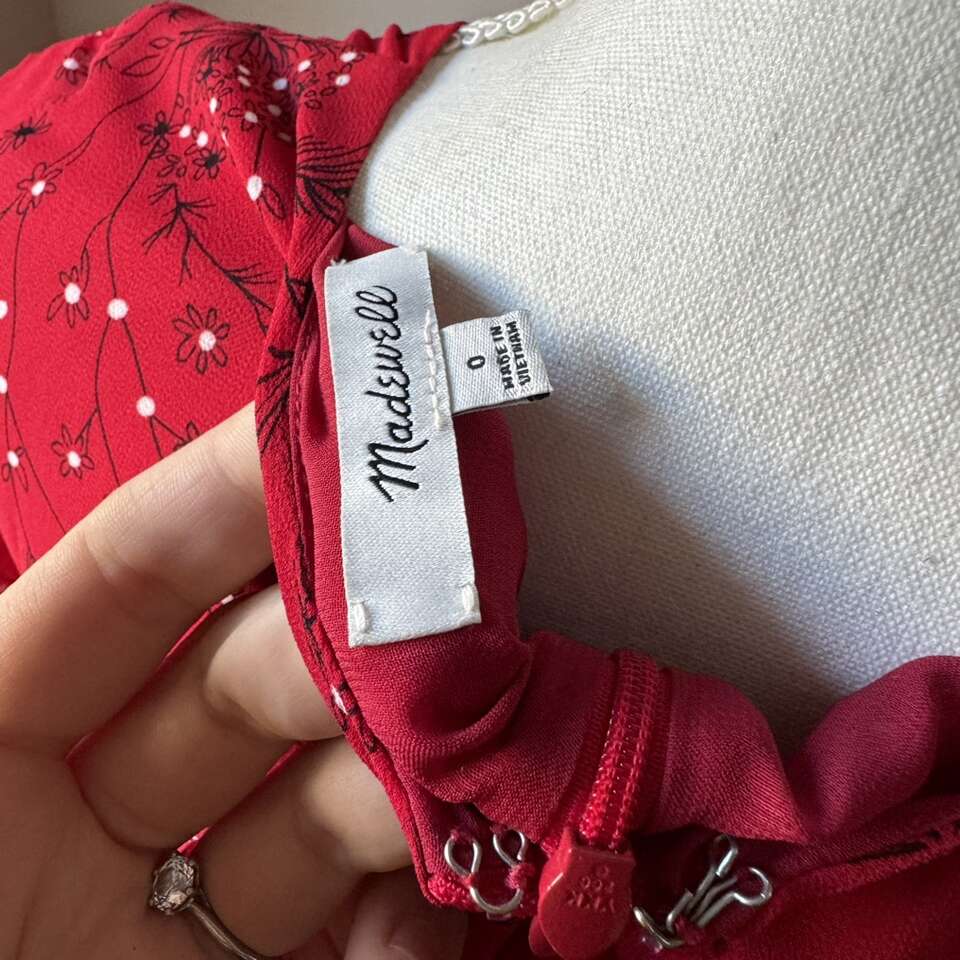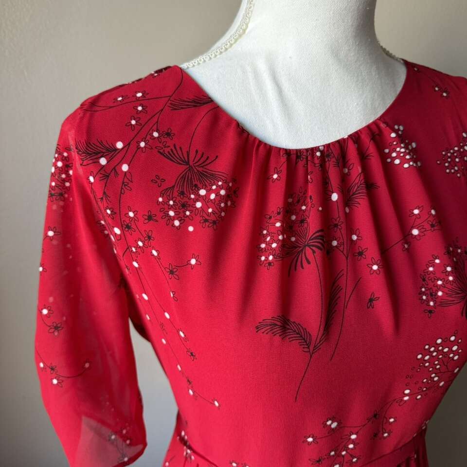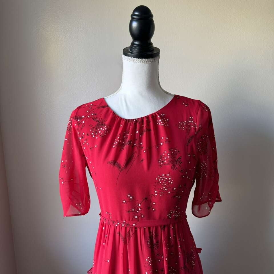 •vibrant red floral print • zigzag tiers •sheet ruffled sleeves • midi dress • fitted bodice • flowy skirt Size: 0 Condition: Good
