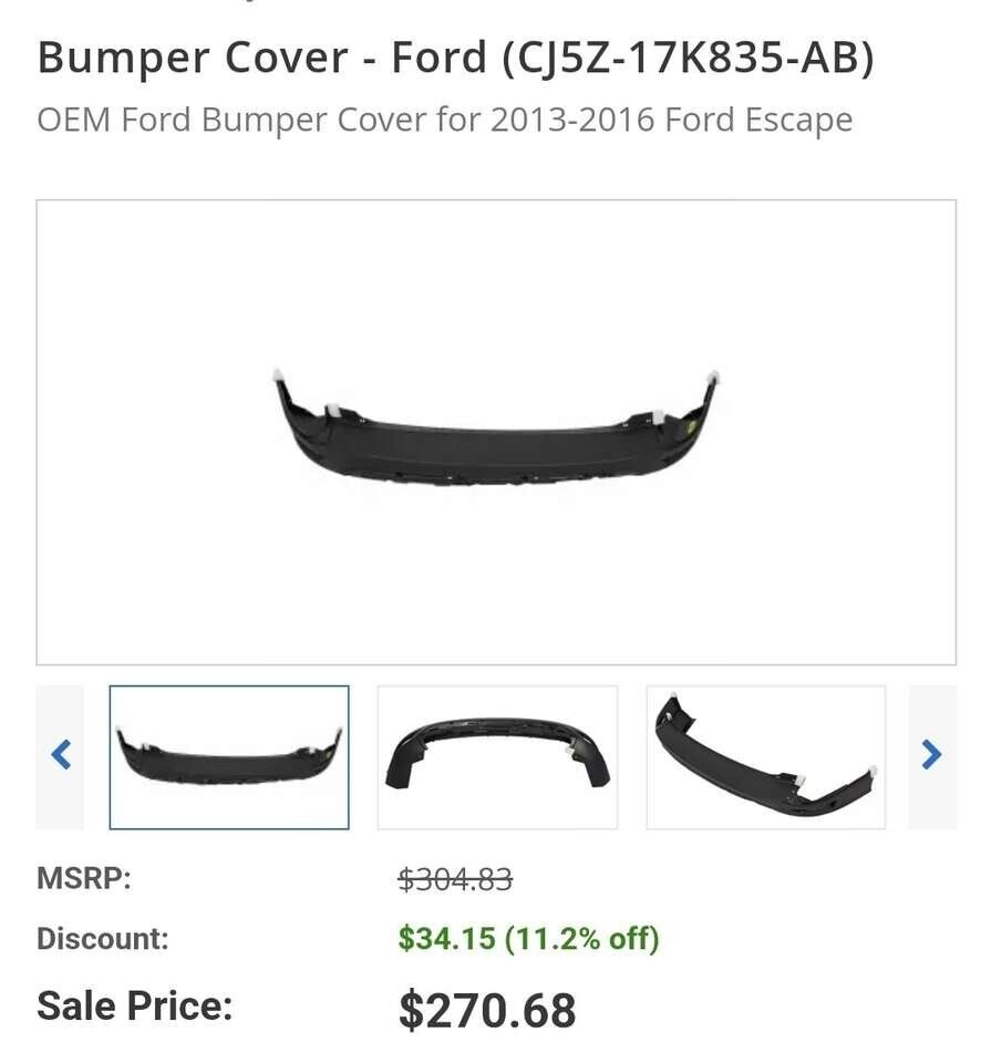 Bumper Cover - Ford (CJ5Z-17K835-AB) OEM Ford Bumper Cover for 2013-2016 Ford Escape Vehicle Fitment Year Make Model Body & Trim Engine & Transmission 2016 Ford Escape S, SE, Titanium 1.6L L4 - Gas, 2.0L L4 - Gas, 2.5L L4 - Gas 2015 Ford Escape S, SE, Titanium 1.6L L4 - Gas, 2.0L L4 - Gas, 2.5L L4 - Gas 2014 Ford Escape S, SE, Titanium 1.6L L4 - Gas, 2.0L L4 - Gas, 2.5L L4 - Gas 2013 Ford Escape S, SE, SEL, Titanium 1.6L L4 - Gas, 2.0L L4 - Gas, 2.5L L4 - Gas