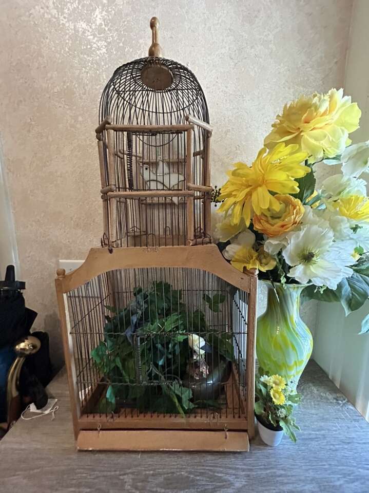 ApplePayTall Bamboo & Wire decorative Bird Cage for decor or small birds. This cage has ALWAYS been used for DECOR, so is still in Like-New-Condition. It Has 2 spring loaded doors, one high & one low. Has a wire ring at the top for perching on. Thin Bottom Panel opens for changing the paper inside the cage. No loose wires, no defects. Smoke free.