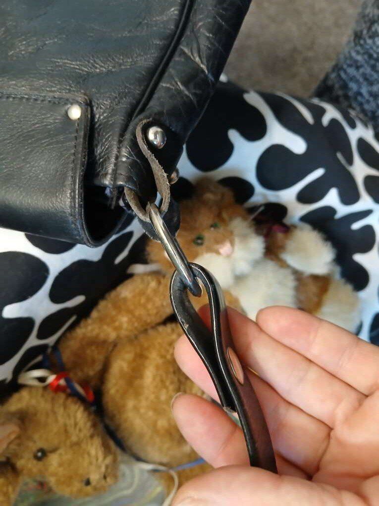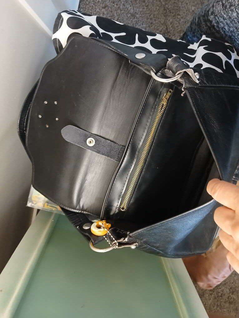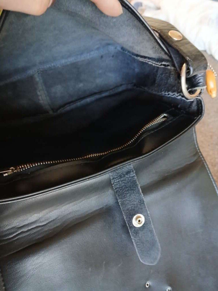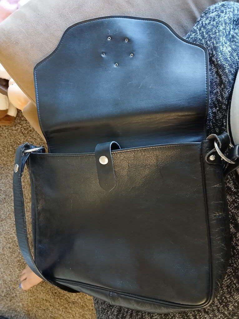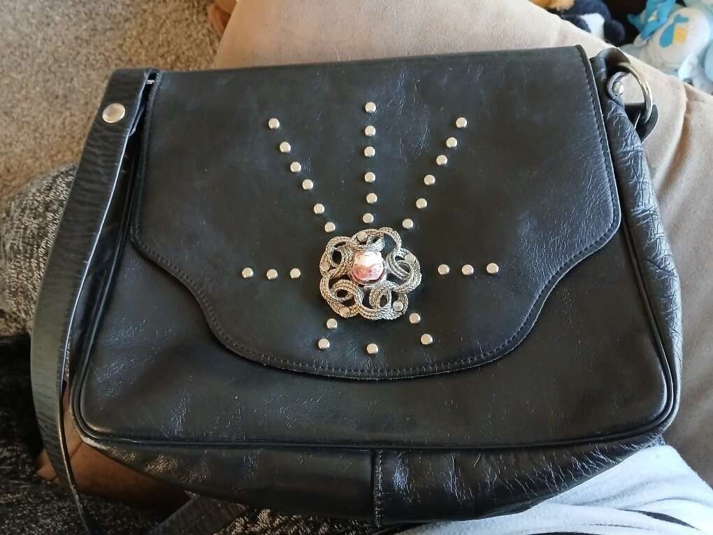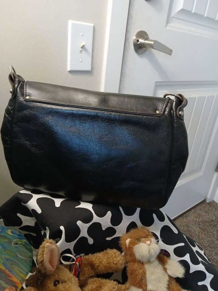 Black leather, silver hardware, snap and flap closure, really killer handbag.