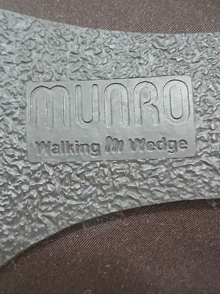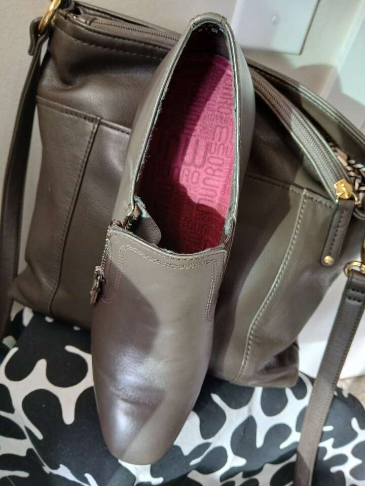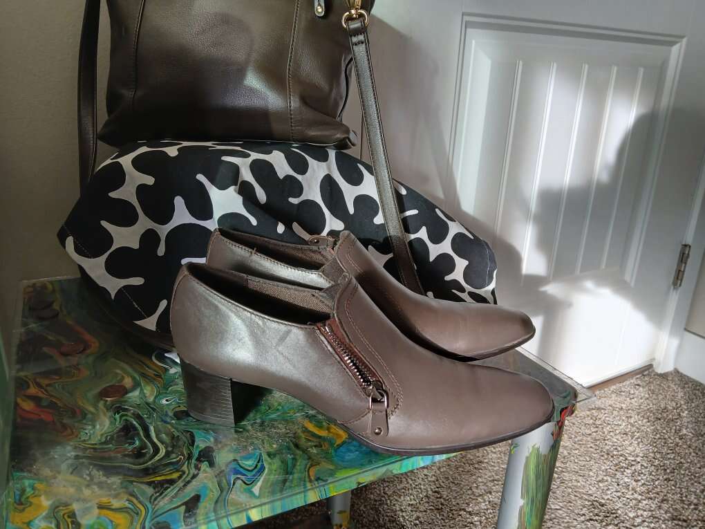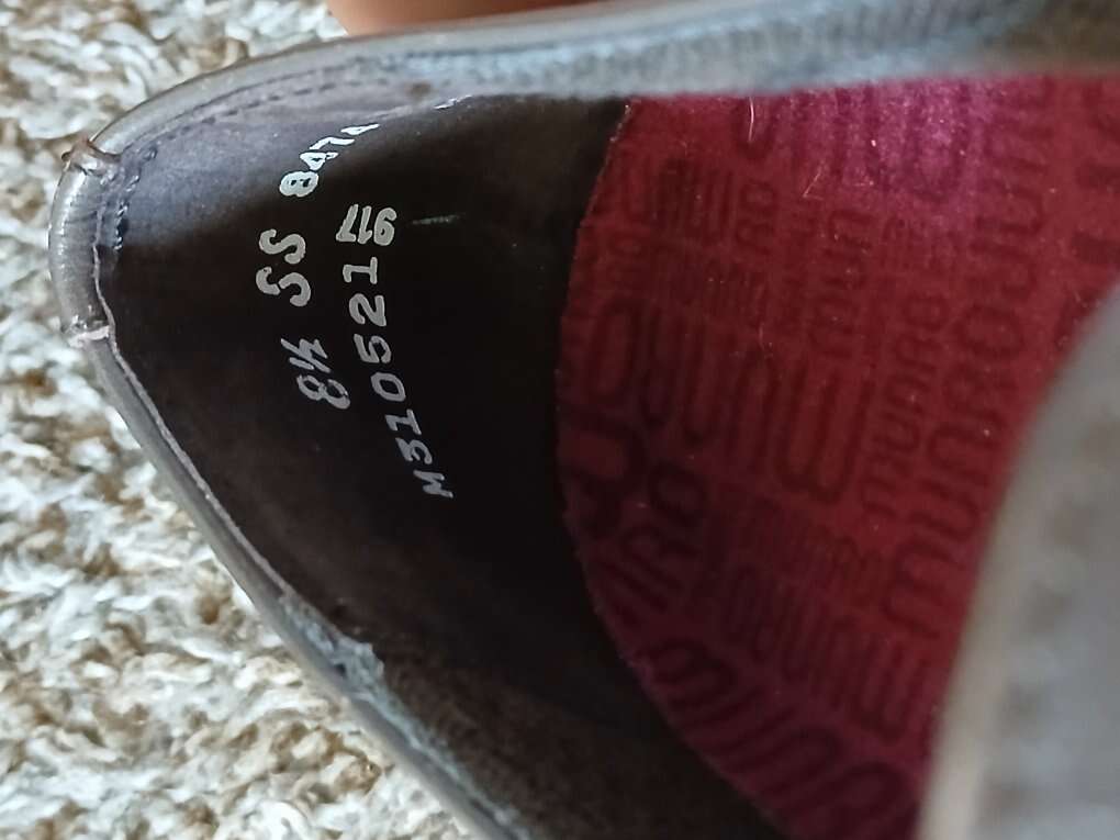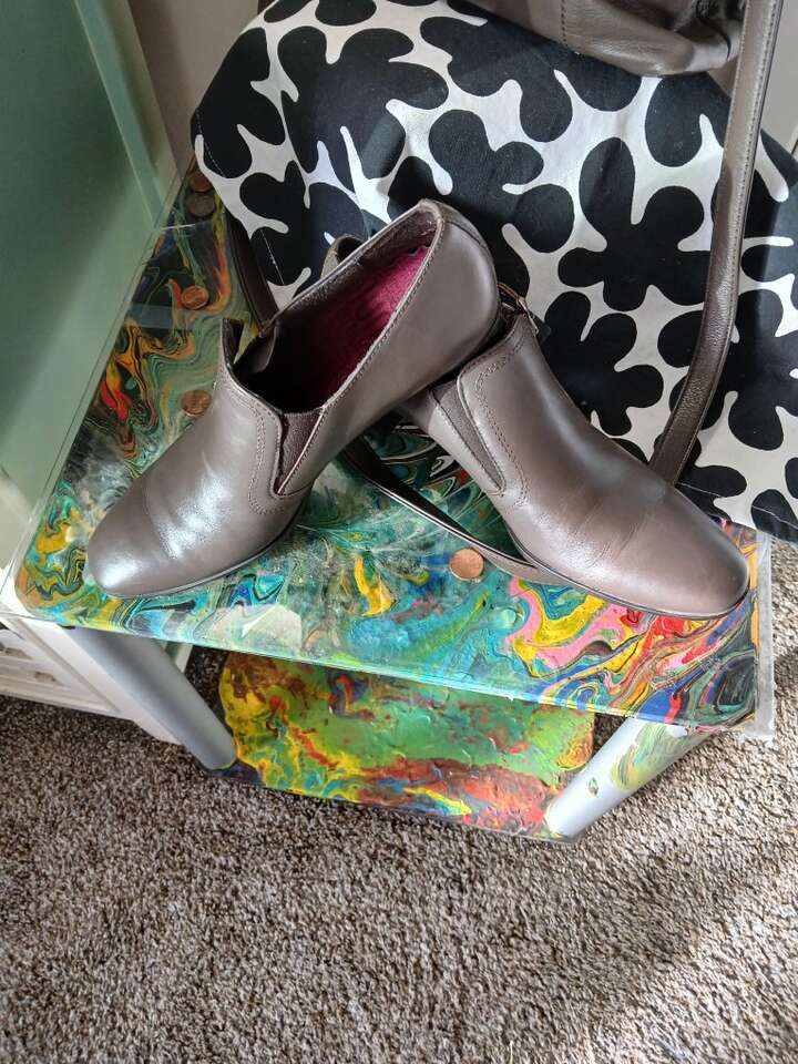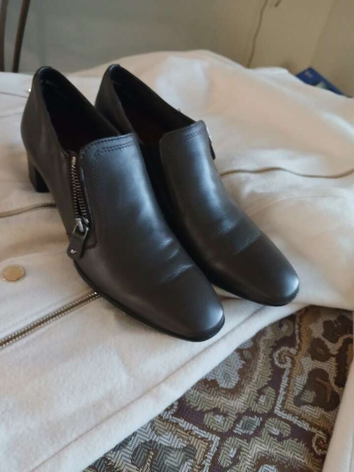 Inch and a half, block heel, rubber sole, leather upper.
