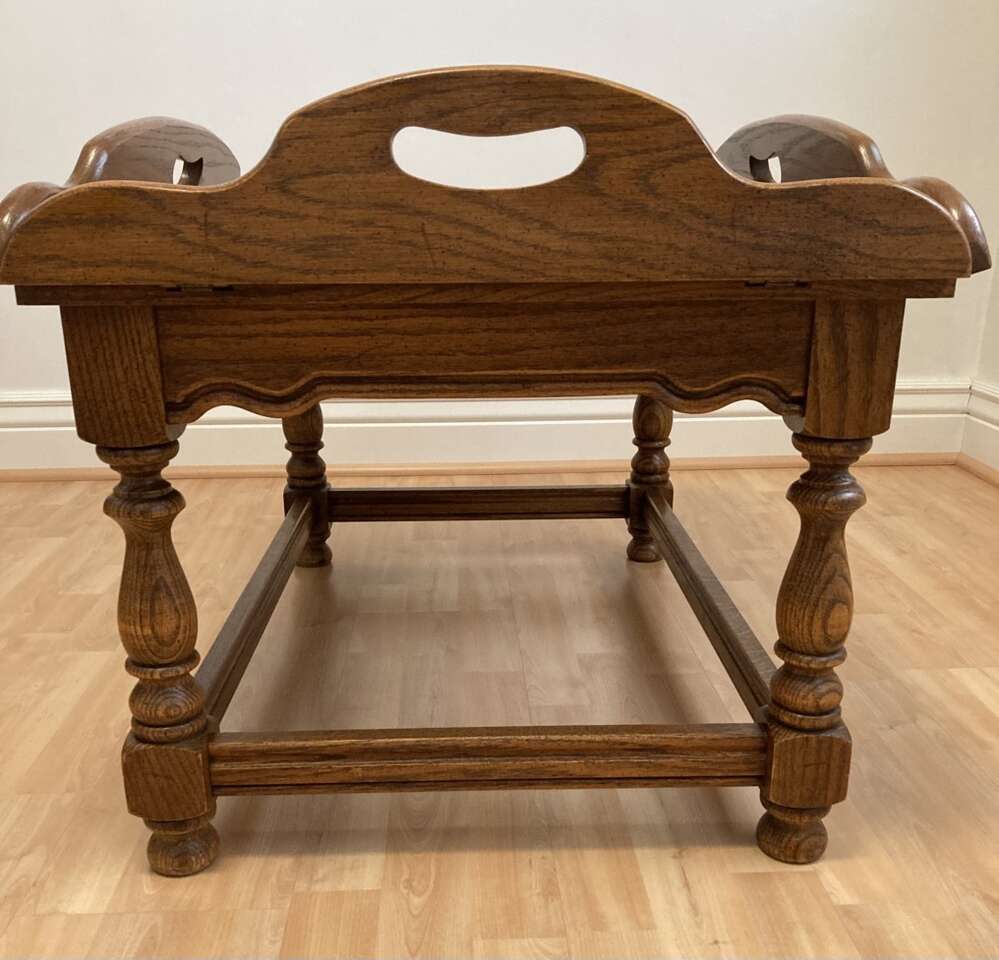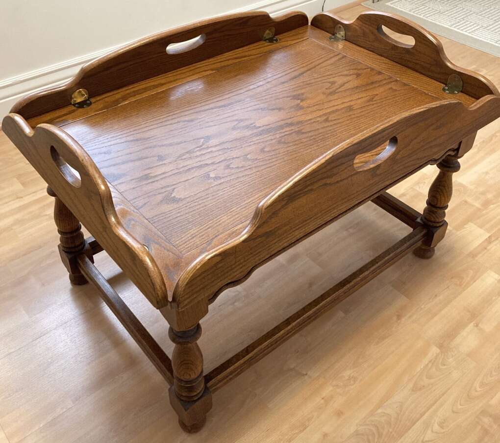 This beautiful butlers table was made by Tell City Chair Company. It is in very nice condition! With the sides down it measures 41.5” L x 31” W x 17” H It’s made of tan bark oak and has wonderful detailing. It’s sure to add a unique touch to any room. Pick up in Murray. Cash only. Thanks!