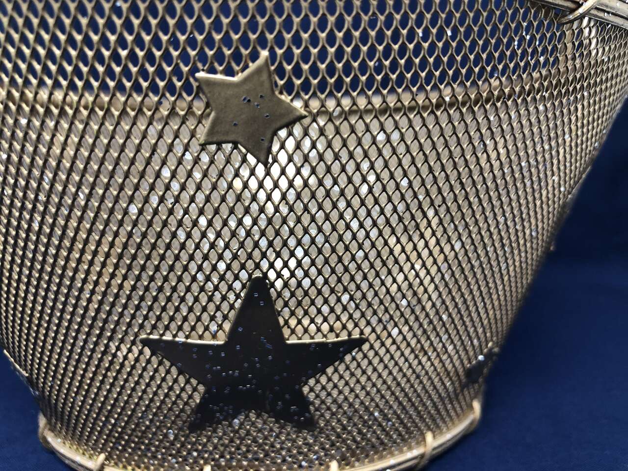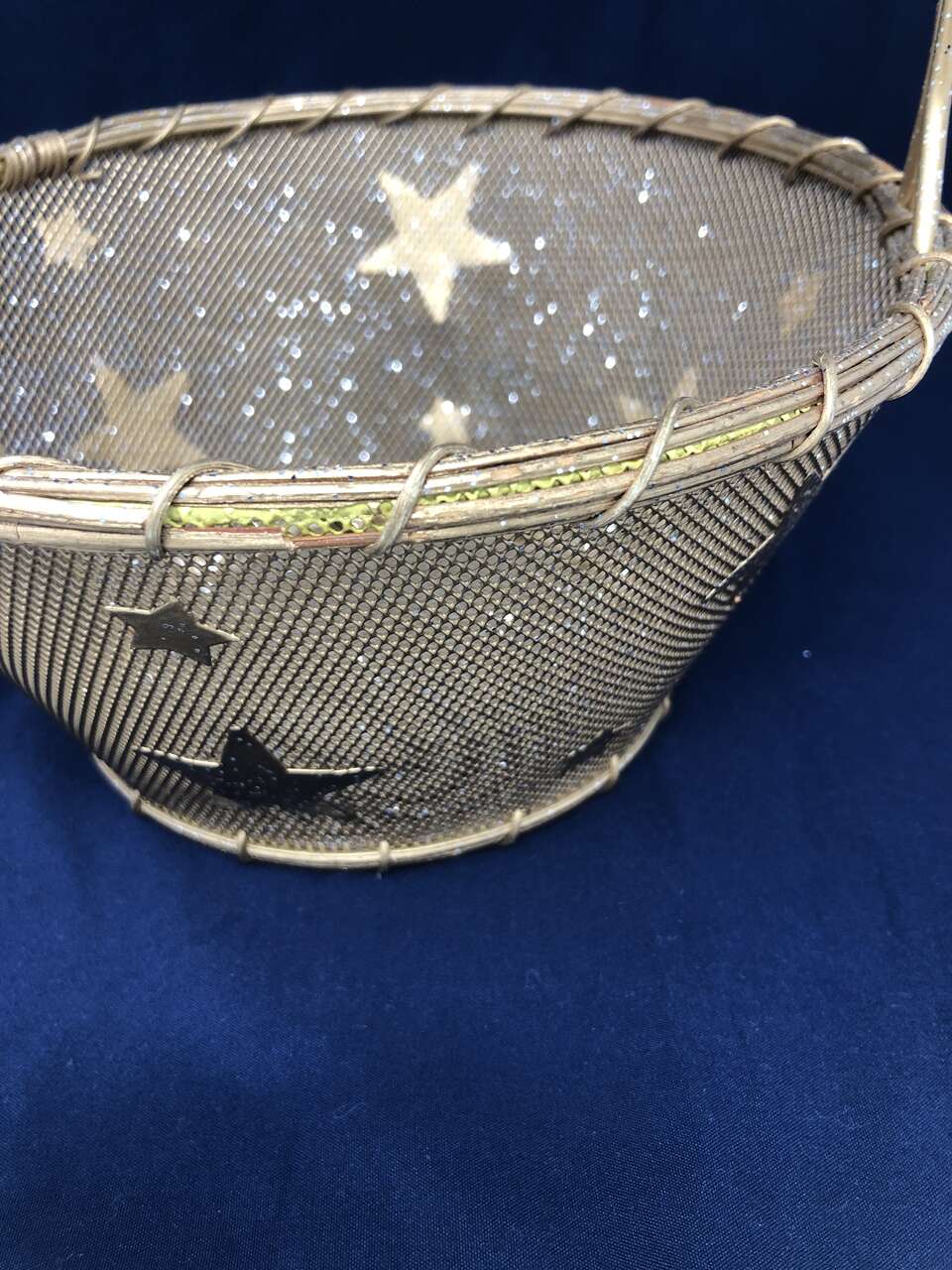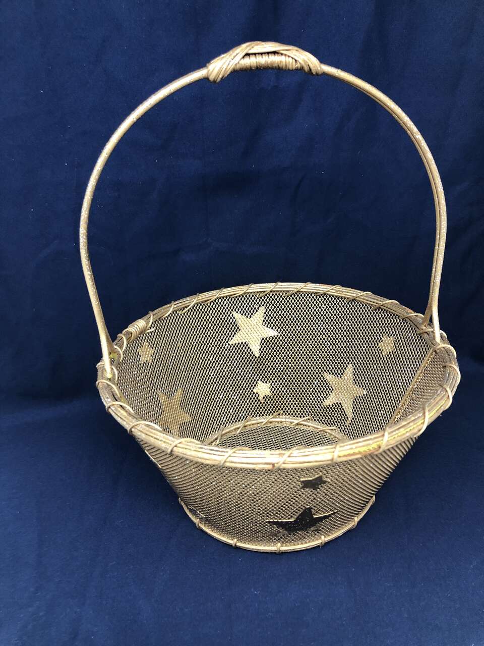 VenmoA beautifully crafted basket to add a little sparkle to any room or gift! This basket is a mix of wicker and wire. Wire makes up the decorative stars, mesh, and handle. The wicker adds great depth at the top of the handle and around the edges of the basket itself. The entire basket is 10 inches high from base to handle. The basket is 4 inches tall, with the smaller base measuring 5 inches and 8 inches at the top. There is a small area around the top of the basket where the wicker has come apart (shown in photos)