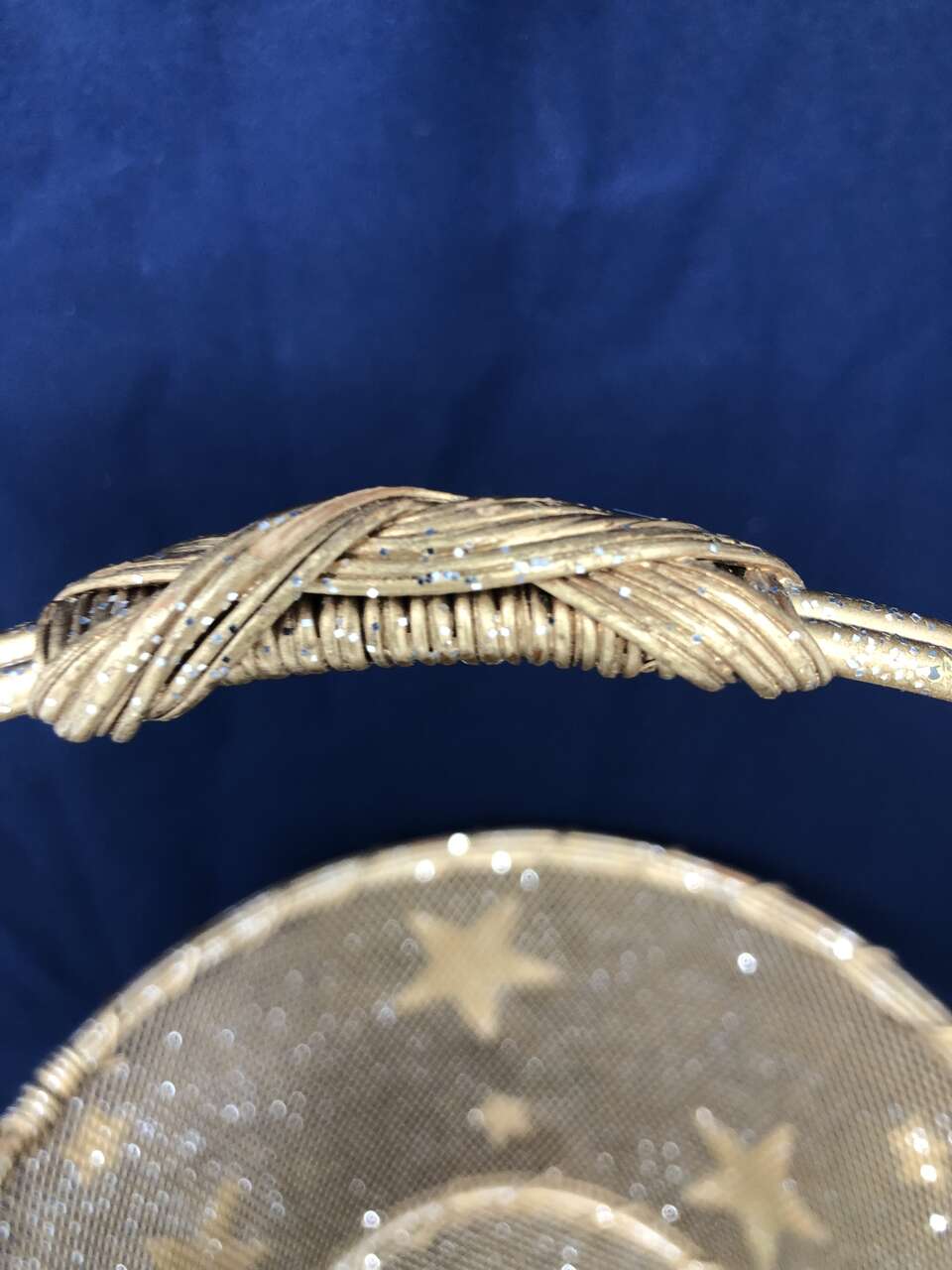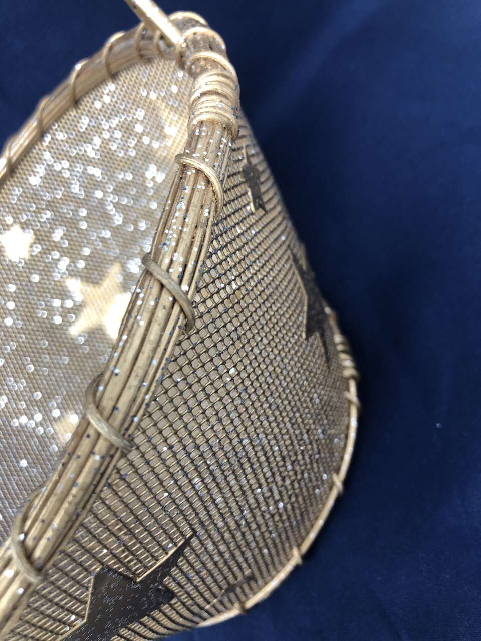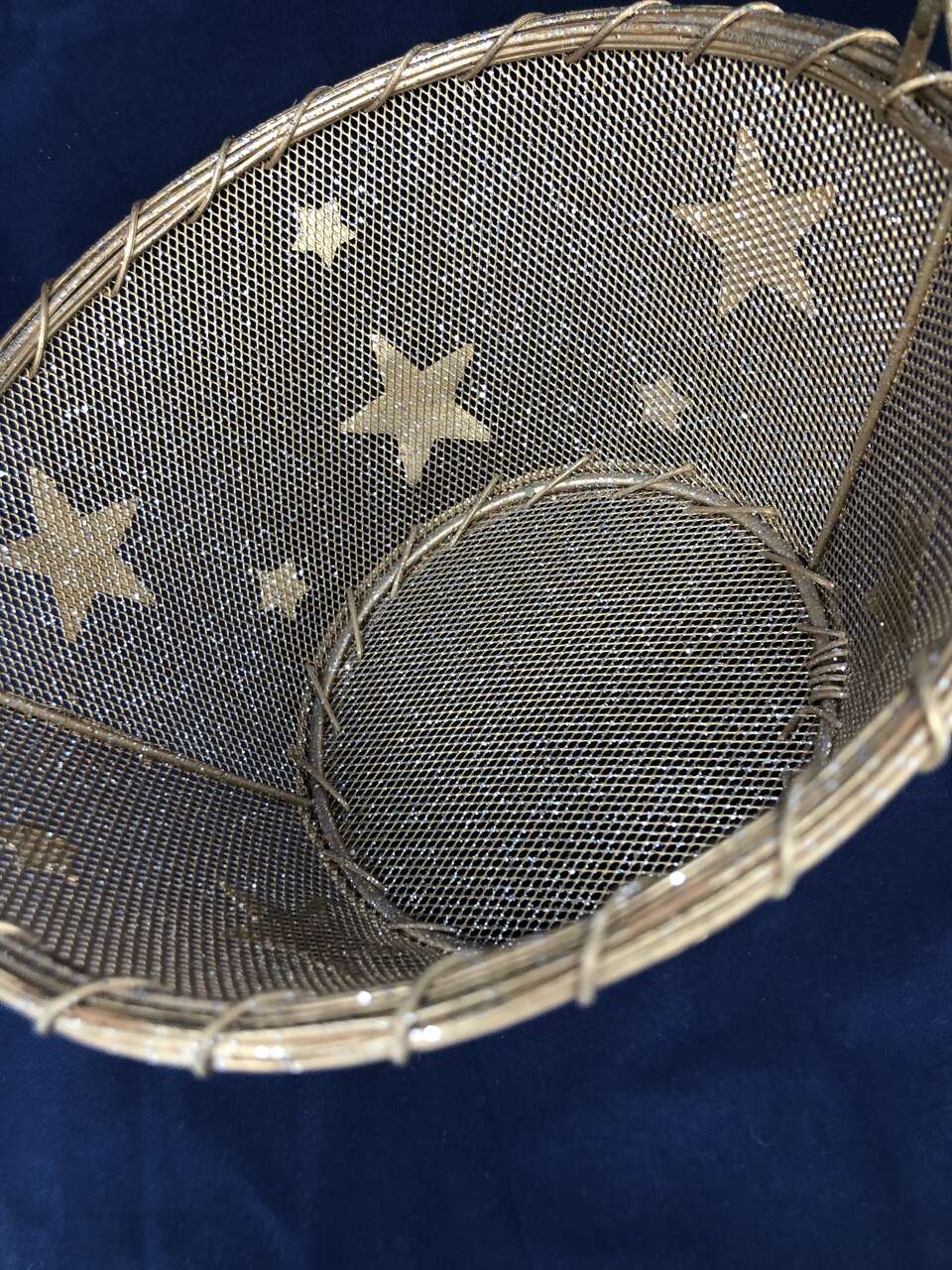 VenmoA beautifully crafted basket to add a little sparkle to any room or gift! This basket is a mix of wicker and wire. Wire makes up the decorative stars, mesh, and handle. The wicker adds great depth at the top of the handle and around the edges of the basket itself. The entire basket is 10 inches high from base to handle. The basket is 4 inches tall, with the smaller base measuring 5 inches and 8 inches at the top. There is a small area around the top of the basket where the wicker has come apart (shown in photos)