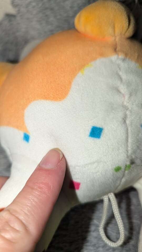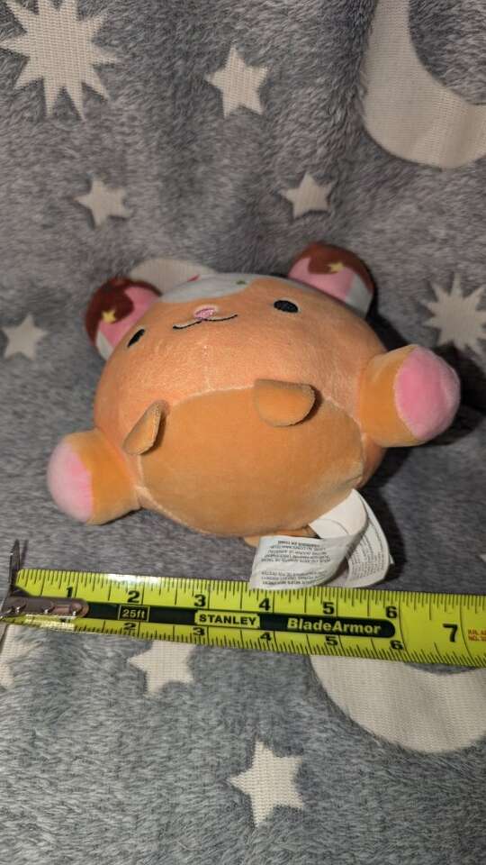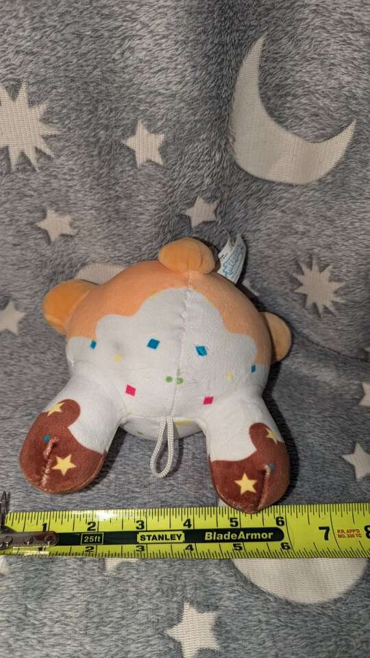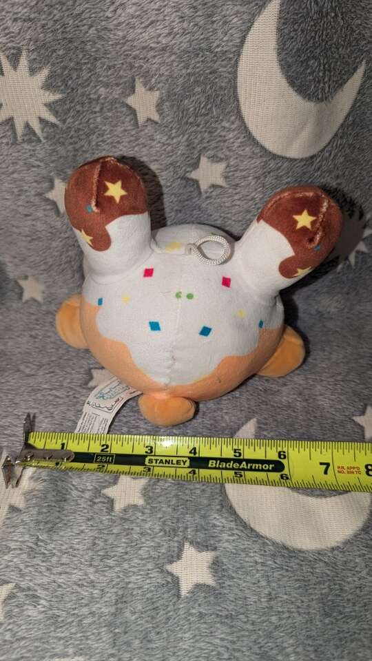 Super cute and very soft. It has a loop on his head to hang him.