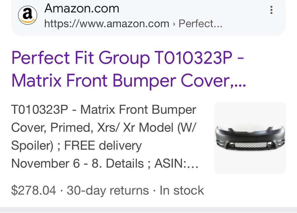 Description- Front bumper cover for 2003-2004 Toyota Matrix XR/XRS with spoiler. See photos for more product information and specifications.