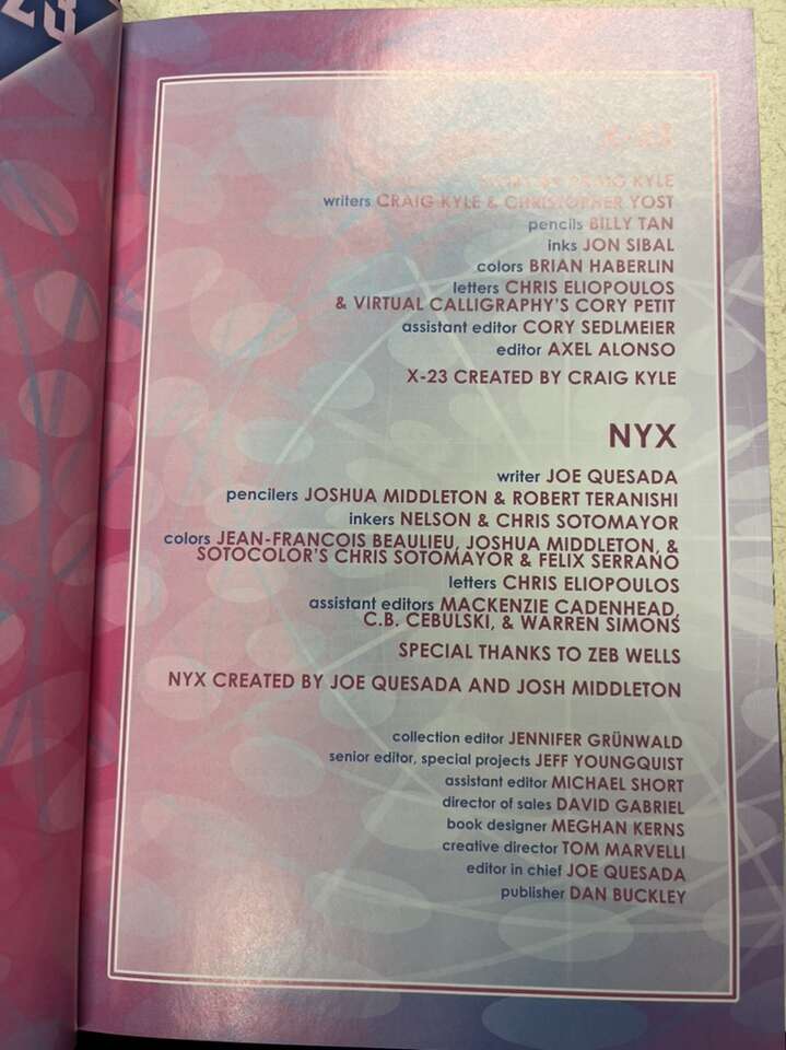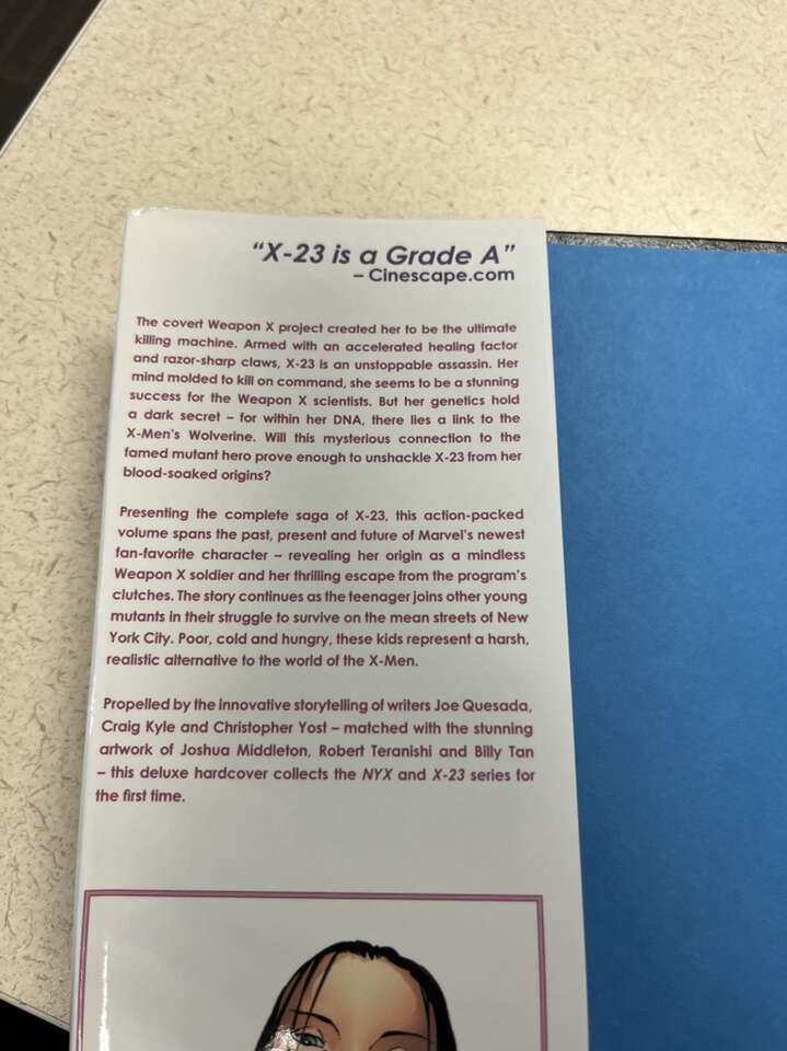 This deluxe hardcover collects the entire senses-shattering saga of X-23, plus an awesome array of adamantium-laced extras! X-23 VOL. 1: INNOCENCE LOST reveals the full story behind the origin of X-23 - who she is, where she came from and the exact nature of her relationship to Wolverine. You think you know, but you have no idea. In NYX VOL. 1: WANNABE, X-23 joins up with a pack of New York City gutterpunks, the likes of which the Marvel Universe has never seen! The X-Men's dream has always been one of creating hope from despair--in a young mutant's darkest hour Charles Xavier will always be just around the corner, ready with open arms and a helping hand. But Xavier can't be everywhere at once. What becomes of a group of young mutants that have to rely on themselves for everything from food to shelter to love? Wayward angels with dirty faces who, instead of preparing for Magneto's next big assault, must learn to survive in the cold, harsh world of the city that never sleeps. The world of the X-Men is brought to the streets, and the struggle for survival has never been more uncertain.
