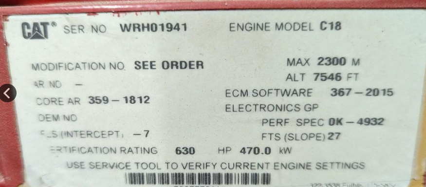 CATERPILLER C18 ACERT, 630HP, SER# WRH01941, ARR# 359-1812, Coreprice: 8500