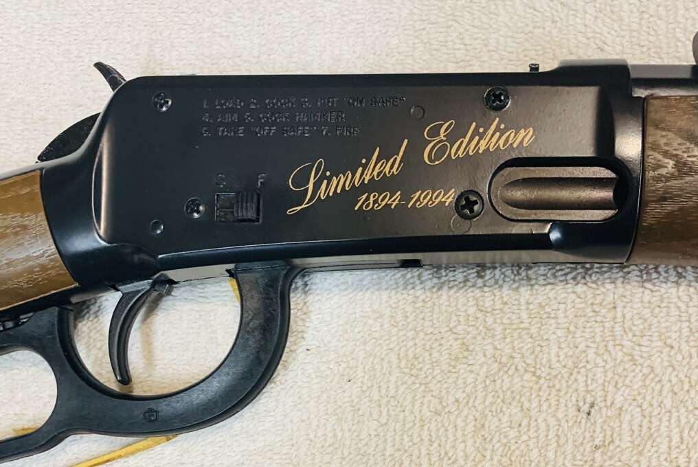 1894-1994 Commemorative BB Lever Action Authorized Winchester Replica. Condition: Like New with Factory Box. Octagonal Shaped 20” Long Steel Barrel. Simulated Wood Grain Stock & Forearm. Metal& High Quality Plastic Construction. Blade Front Sight & Adjustable Open Rear. Right Side Loading Gate - 40 Shot Capacity. Works with both Steel & Lead .177 Cal BB’s. Manufactured in 1994.