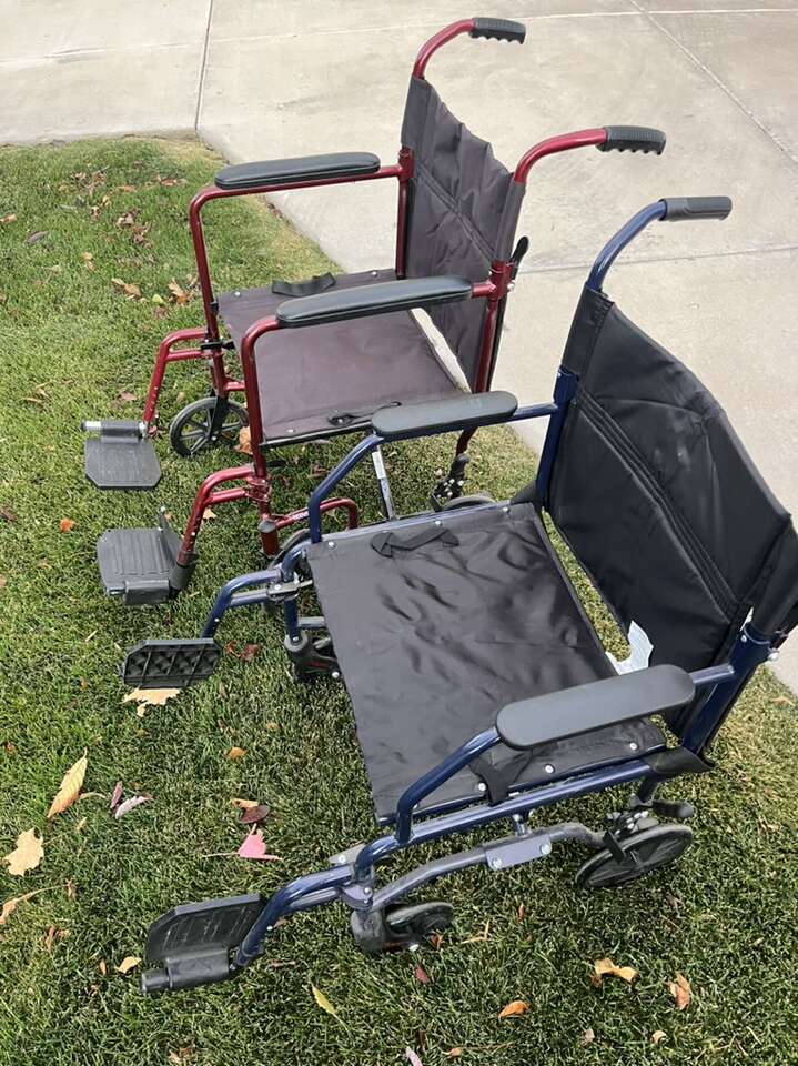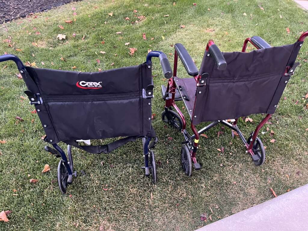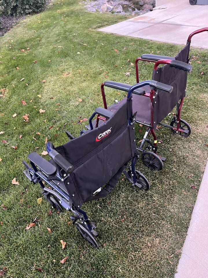 Transport chair, folds up nicely to fit in trunk or a large suitcase, foot pedals are detachable, they weigh about 19 to 20 pounds.