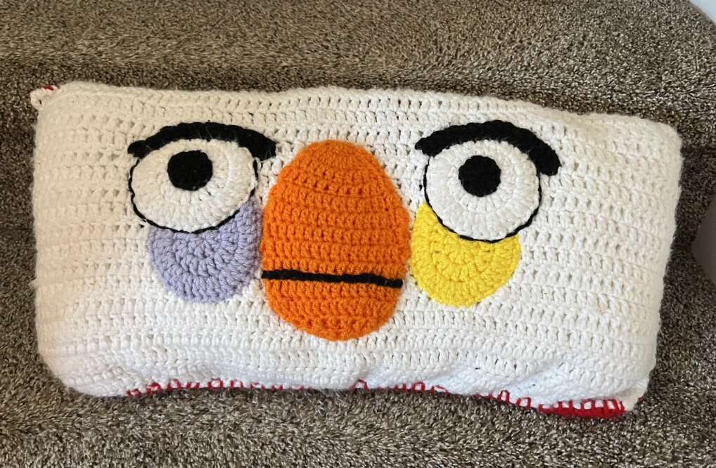 Handmade/Crocheted Angry Birds decorative pillow. It is 24” x 11” x 3,5”. $10
