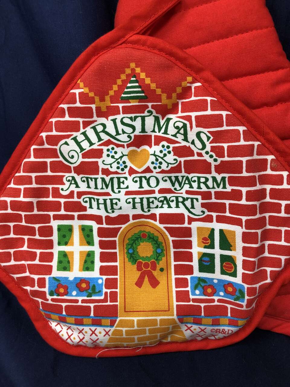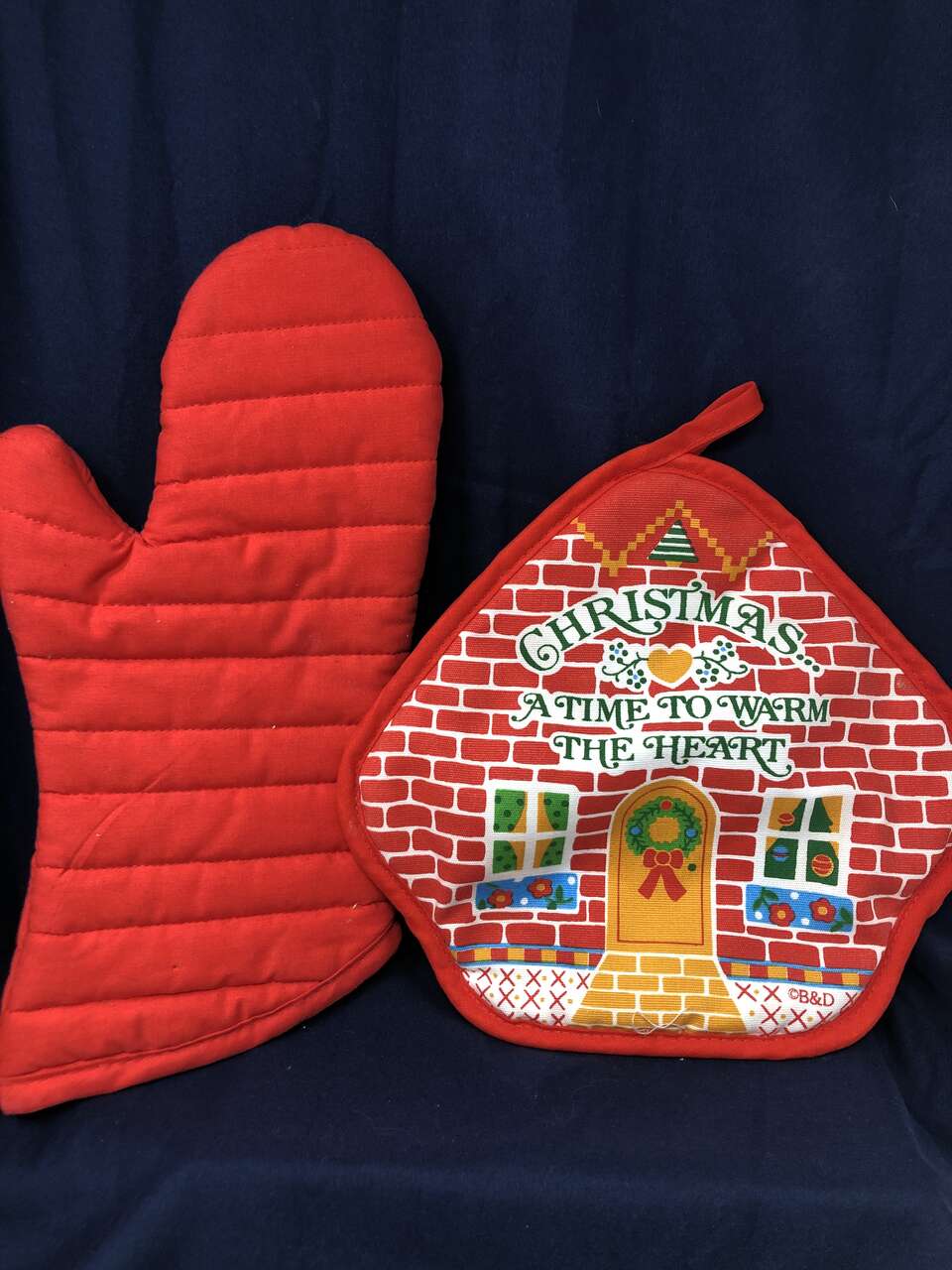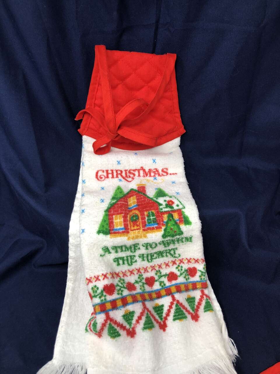VenmoWhat a beautiful to warm your kitchen with this matching set of, Christmas: A Time to Warm the Heart oven mitt, hot pad, and wash cloth. They are just darling. 100% cotton. And the towel has a hot pad edge with strings to create a beautiful bow and a gorgeous pleat on the back. Measurements: Hot pad: 9x9.5 Oven Mitt: 12x6 1/4 Towel: 16x5.5