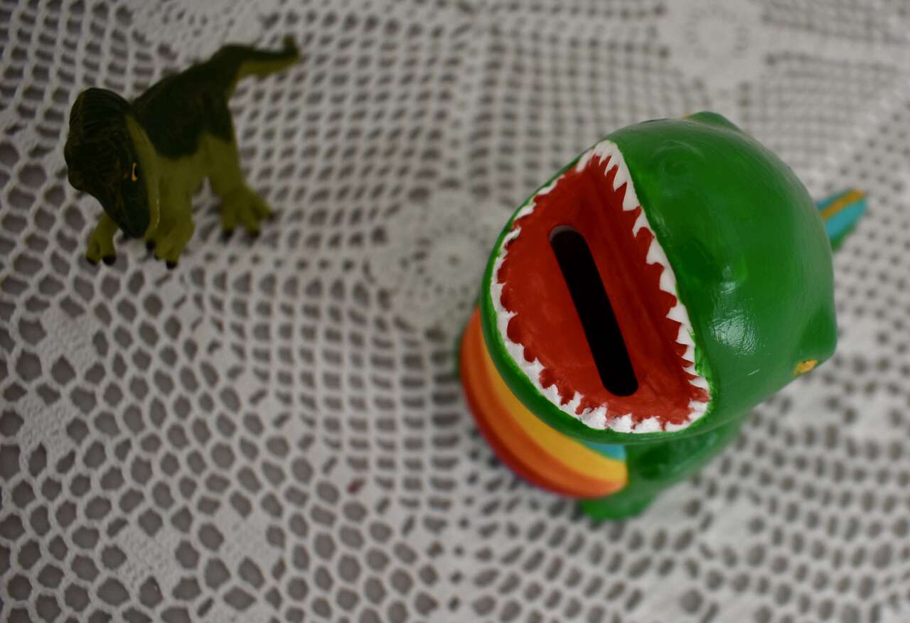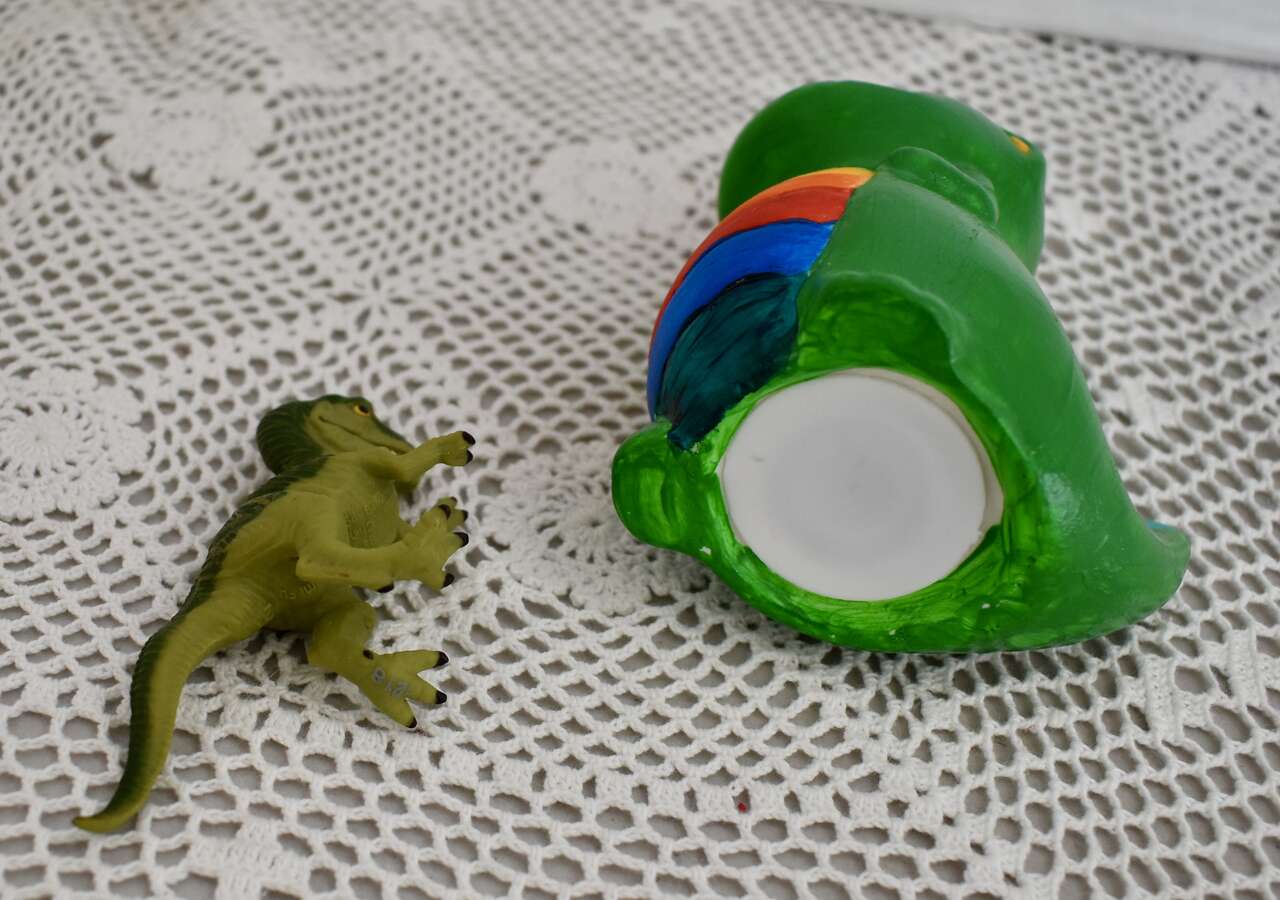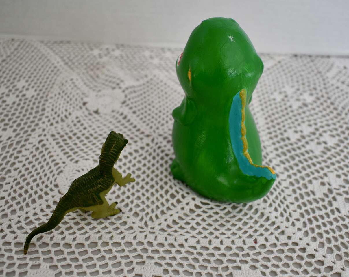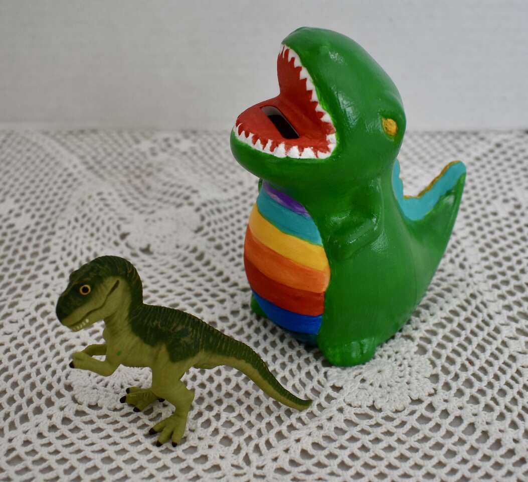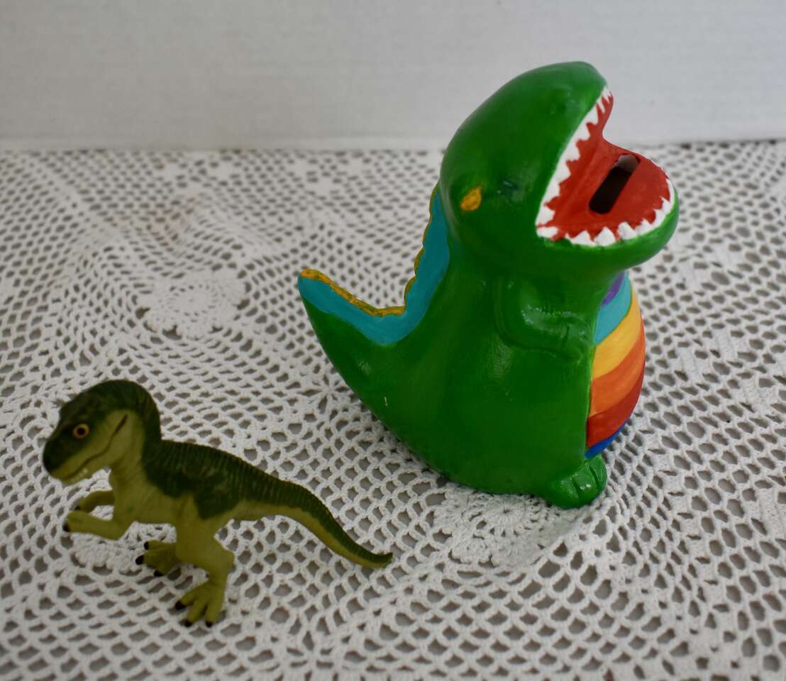 IT MEASURES… The Hand Painted Ceramic Dinosaur Bank Measures… Approx. 4 3/4 inches tall and 4 inches wide from the belly to the tail and the little plastic dinosaur toy Measures.. Approx. 2 1/2 inches tall and Approx. 3 inches wide from the hands to the tail area side to side.
