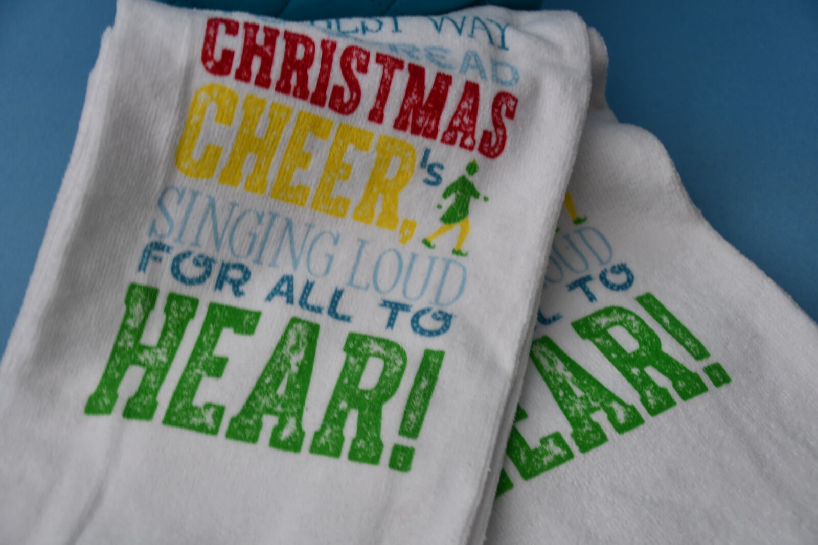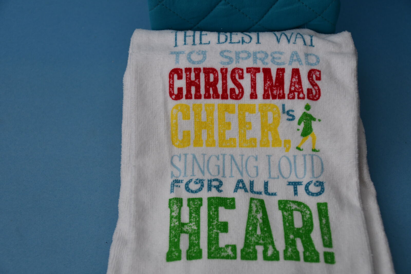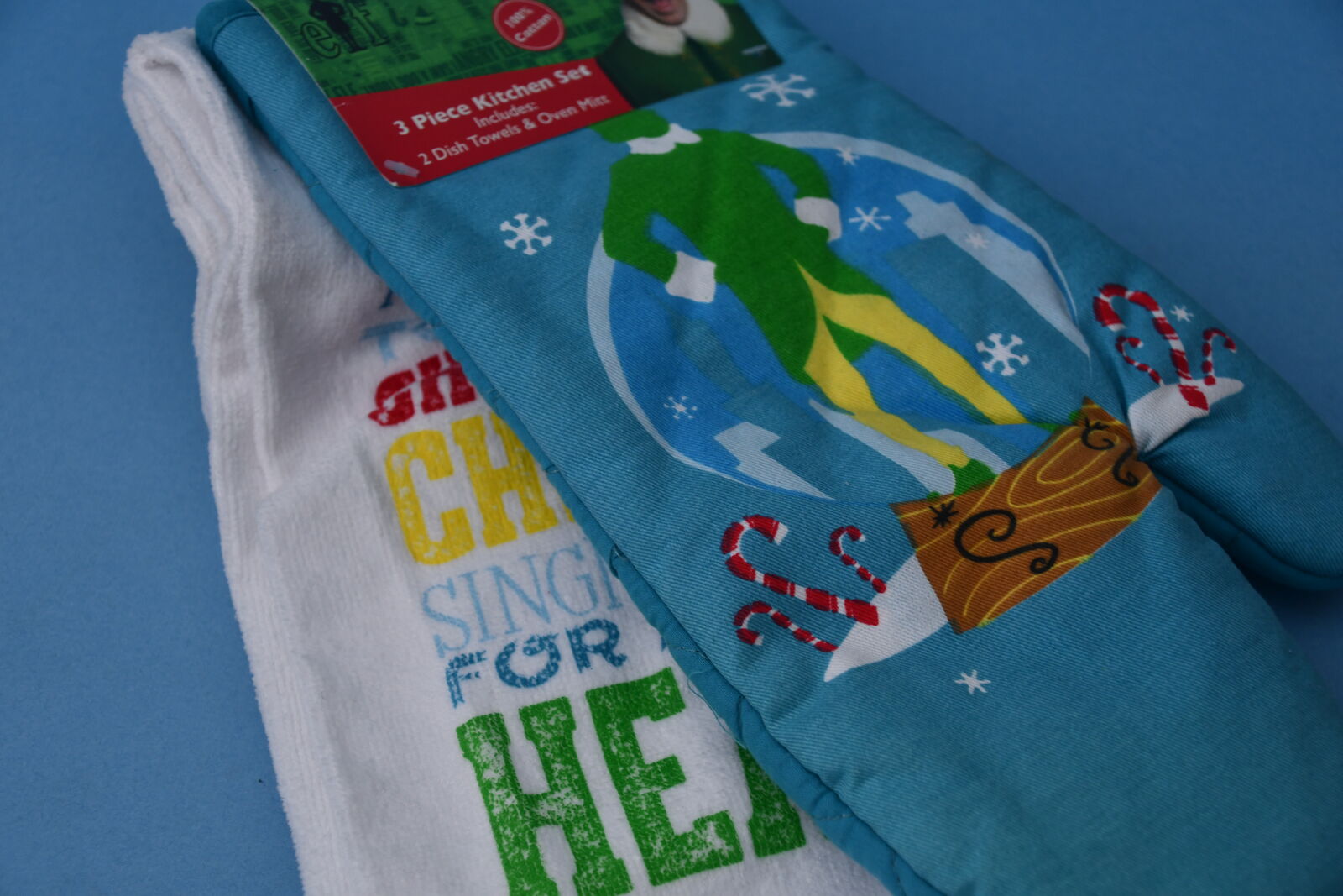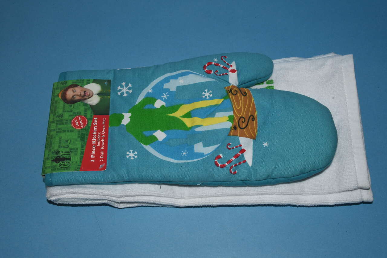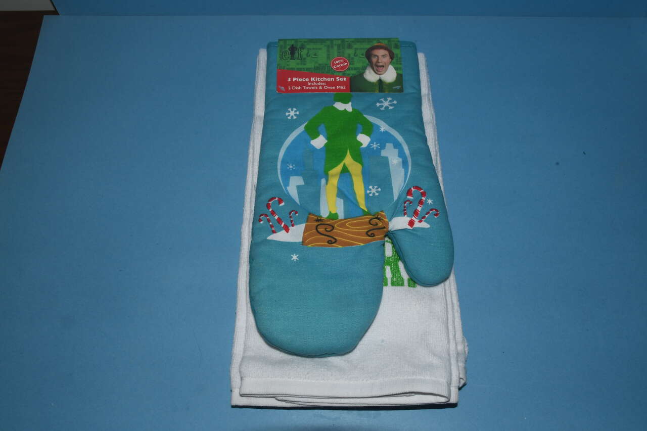 This NWT BUDDY THE ELF 3 Piece Kitchen Set is from a smoke free home. The towels say " The Best Way To Spread Christmas Cheer is Singing Loud for all to Hear" Questions??? Please ask. We are located in Plain City. Cash only please.