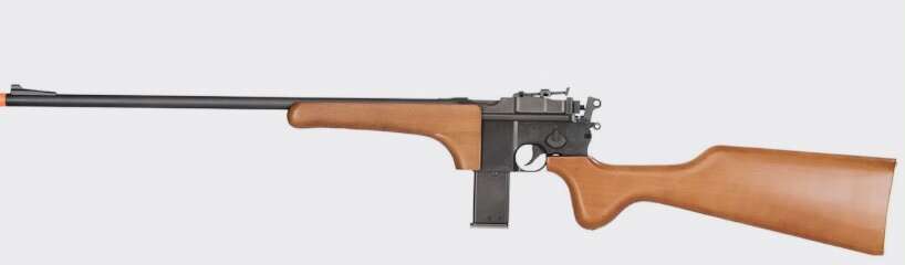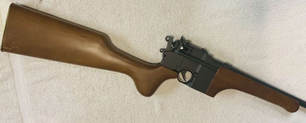 Full-size & Weight Box Cannon 6mm Sniper Rifle. Condition: Rifle Metal& Magazines Excellent, Wood Slightly Marked. Shinny Brass Buttplate. Green Gas Powered - 26 Round Magazines. All Metal with Real Wood Stock & Forearm. Ramp Front Sight Notched Rear Sight with Elevation adjustment. 26” Long Brass smooth bore Inner Barrel. Adjustable HOP- UP - Use Small Allen Wrench. Manual Safety located on left side of Hammer. Single and Double Action Operated.
