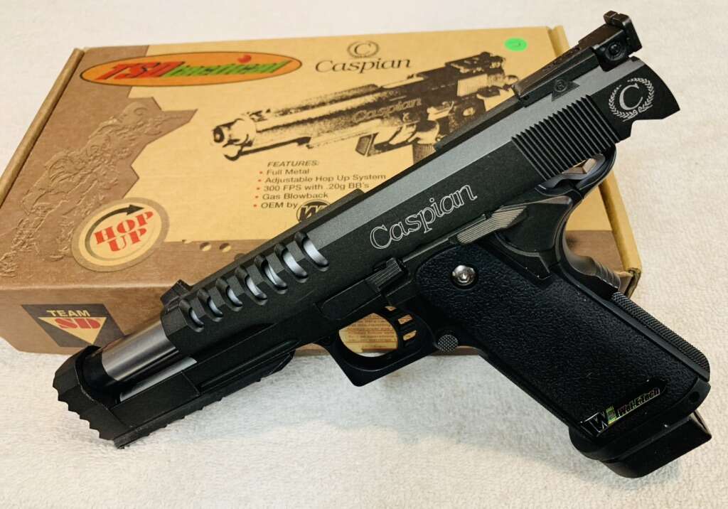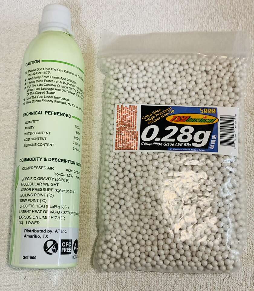 Items Included: Pistol & Factory Box. Two 30 Round Standard Length Gas Magazine & One Extended Length (8”) 45 Round. One 34 Fluid Ounce Container of Green Gas. One Allen Wrench for adjustable Hop-Up. One (5,000 Qty) Bag of 0.25g TSD white BB’s. Operations Manual.