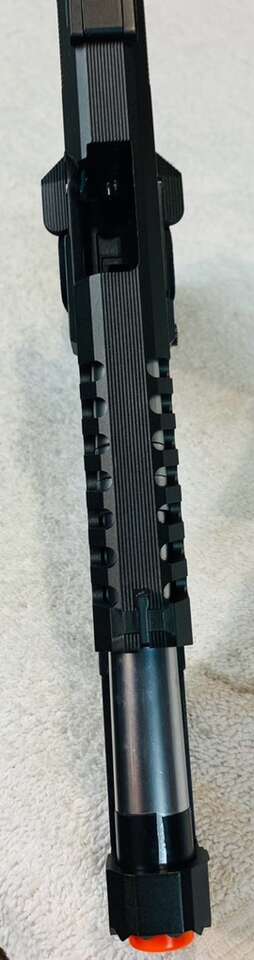 6mm Air Soft Gas Blowback 2011 Style Pistol. Condition: Like New (excellent). Full Size & Weight, Customized Open Slide. Bottom Weaver Rail for Accessories. Ambidextrous Manual Safety. Semi Auto with Blowback Action & Felt Recoil. All Metal, except the High Quality Plastic Grip. Dot-Blade Front Sight & Adjustable Rear.