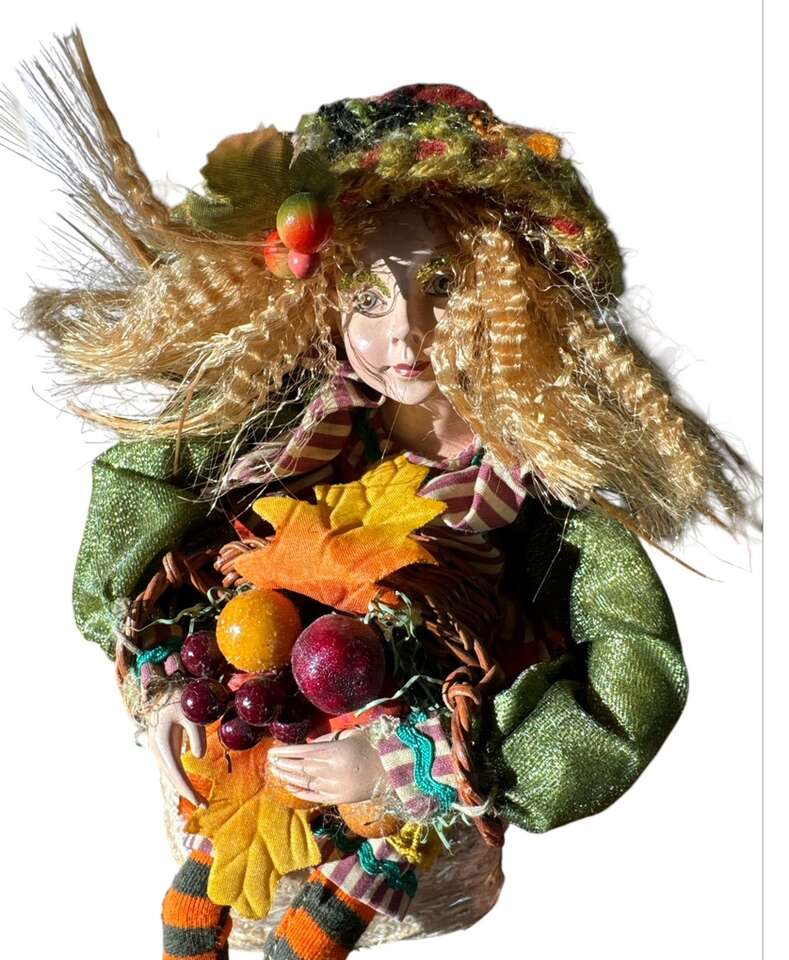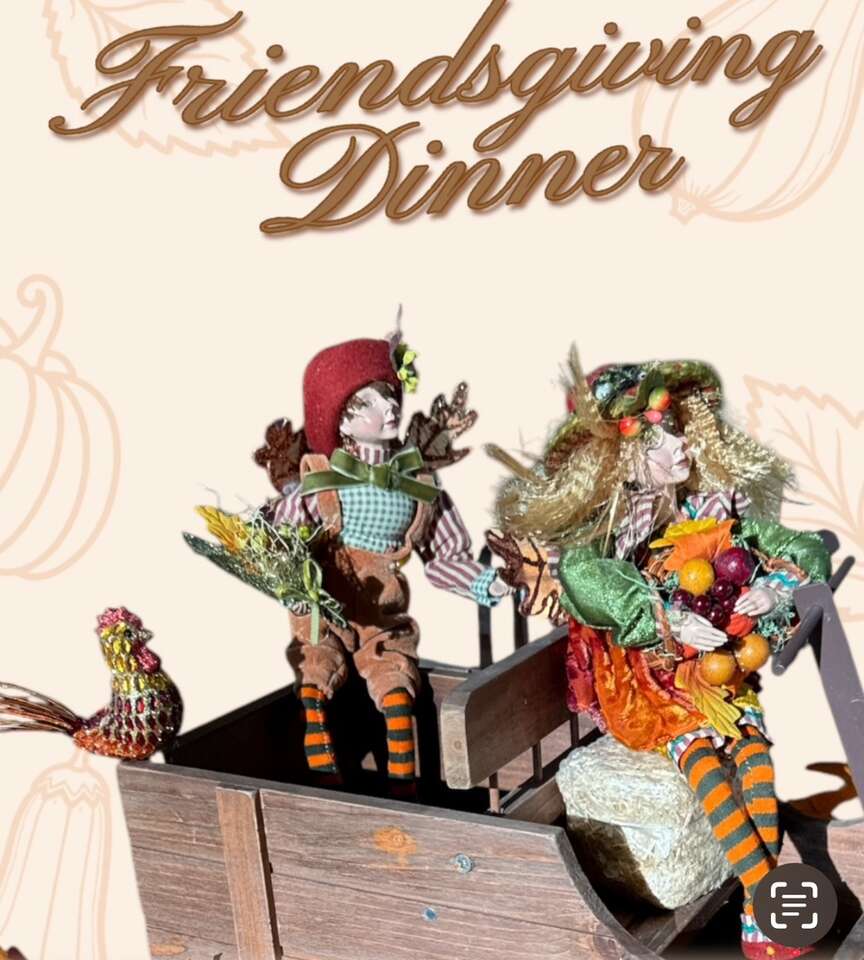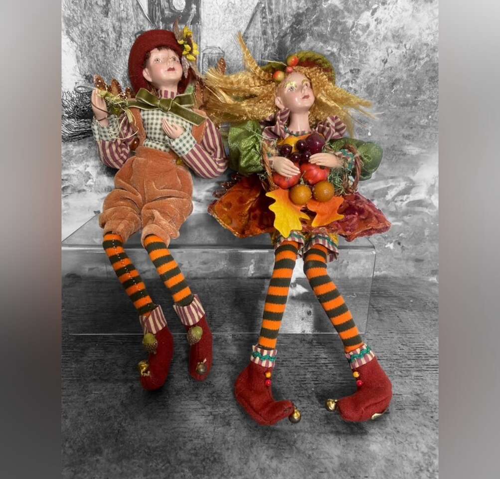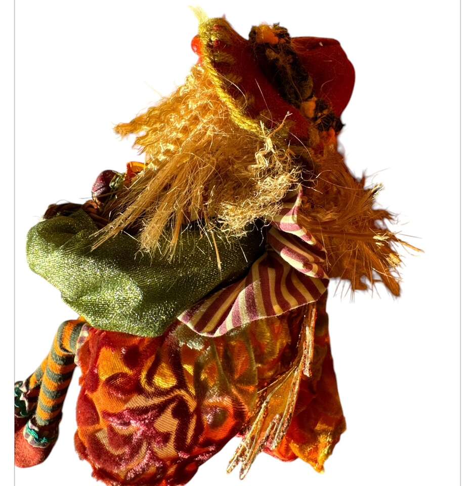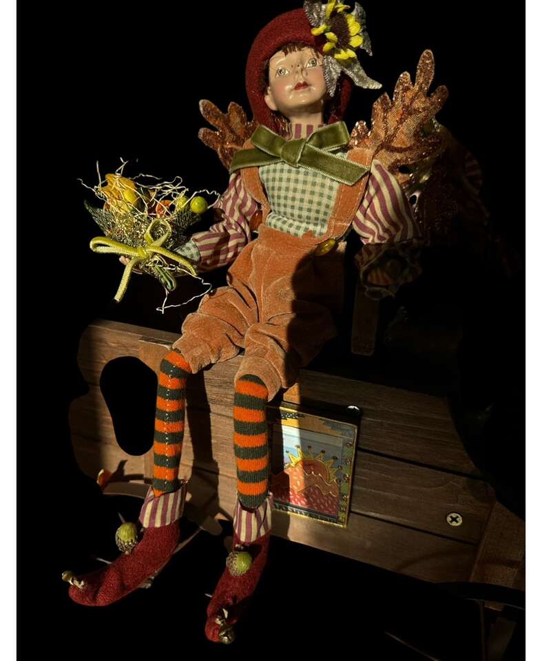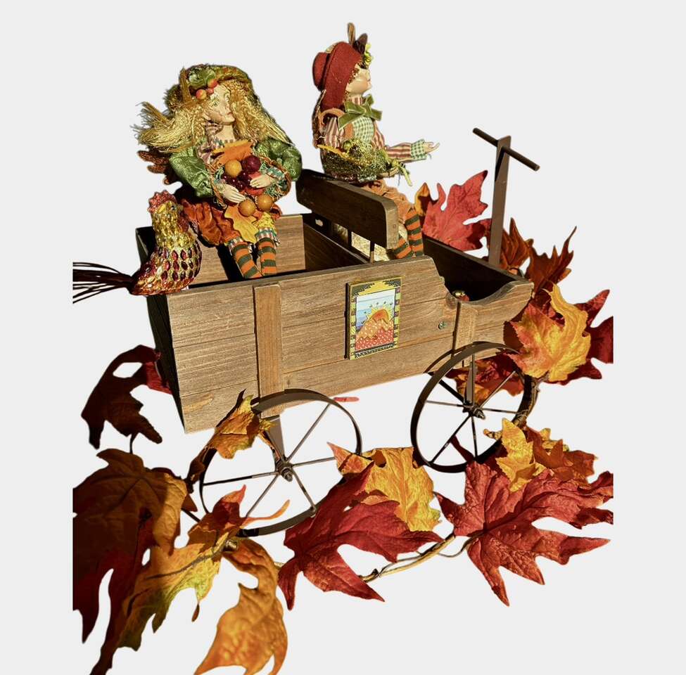 VenmoThanks giving centerpiece 12 tall male @ female, wagon is 13.5 long 11 tall. Rooster sitting in the back of wagon and fall leaf garland on the bottom. The wagon has magnets on the side a sunset is stray magnetically to the side the dolls dressed in boho clothes, the ferry wings are leaves. The driver sits in a bail of hay