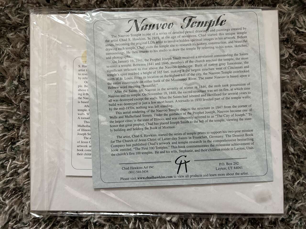 I have a Picture - Nauvoo Temple Drawing/Double matted by Chad Hawkins (8 In x 10 In) for $10 cash. This is brand new and still in the plastic wrapping. This has been in a smoke/pet free home. Contact me to see.