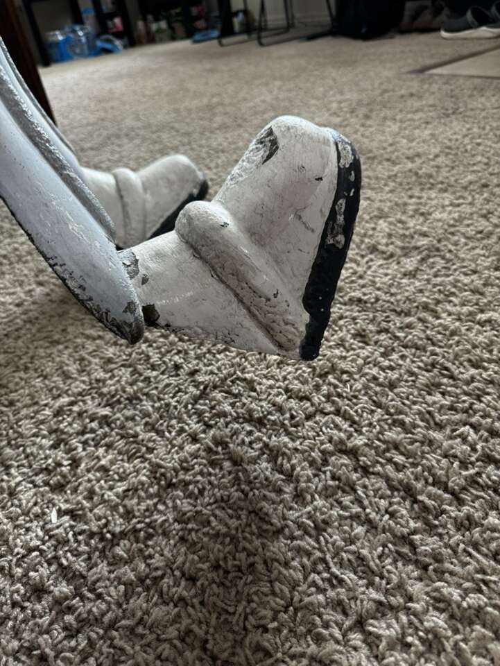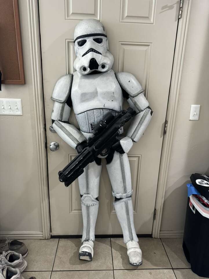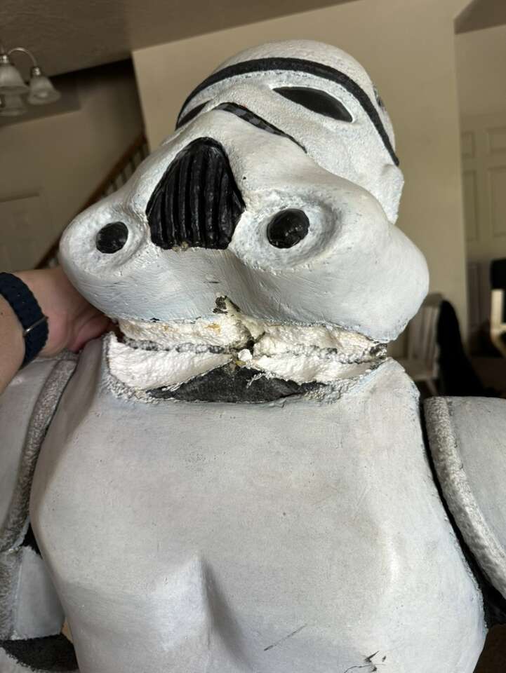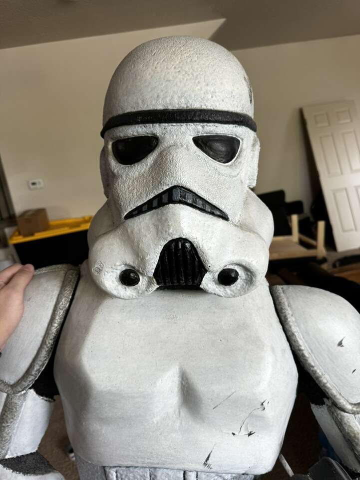 VenmoLife size hard styrofoam storm trooper. The neck and one of the feet are torn, but still attached and not super noticeable when stood up.