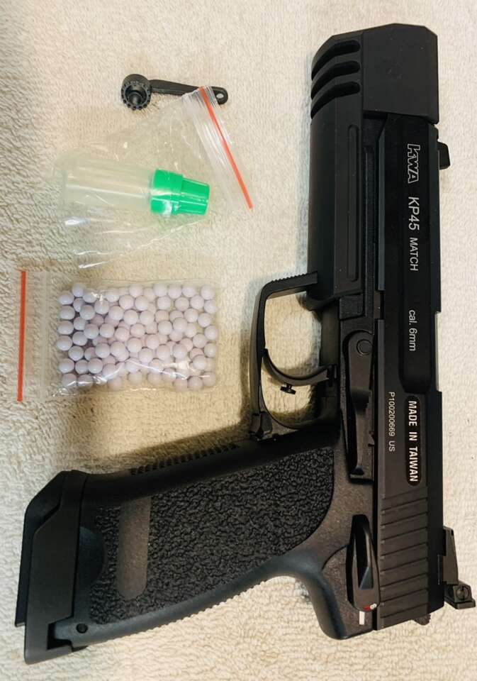 6mm AirSoft Gas Blowback Semi-Auto Pistol. H&K MK23 Replication. Full Size & Weight. Condition: Like New (excellent). S/N P10200669 US Customized to add Match Grade Sights, Extended Barrel & Ribbed Compensator. Ambidextrous Manual Safety. KWA NS2 Blowback Action & Felt Recoil. Combination of Metal & High Impact Quality Polymer. High Post Front Sight & Adjustable Rear.