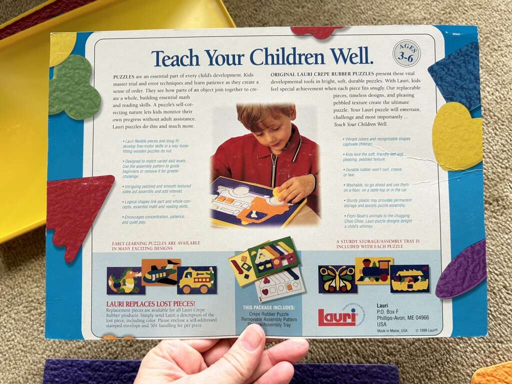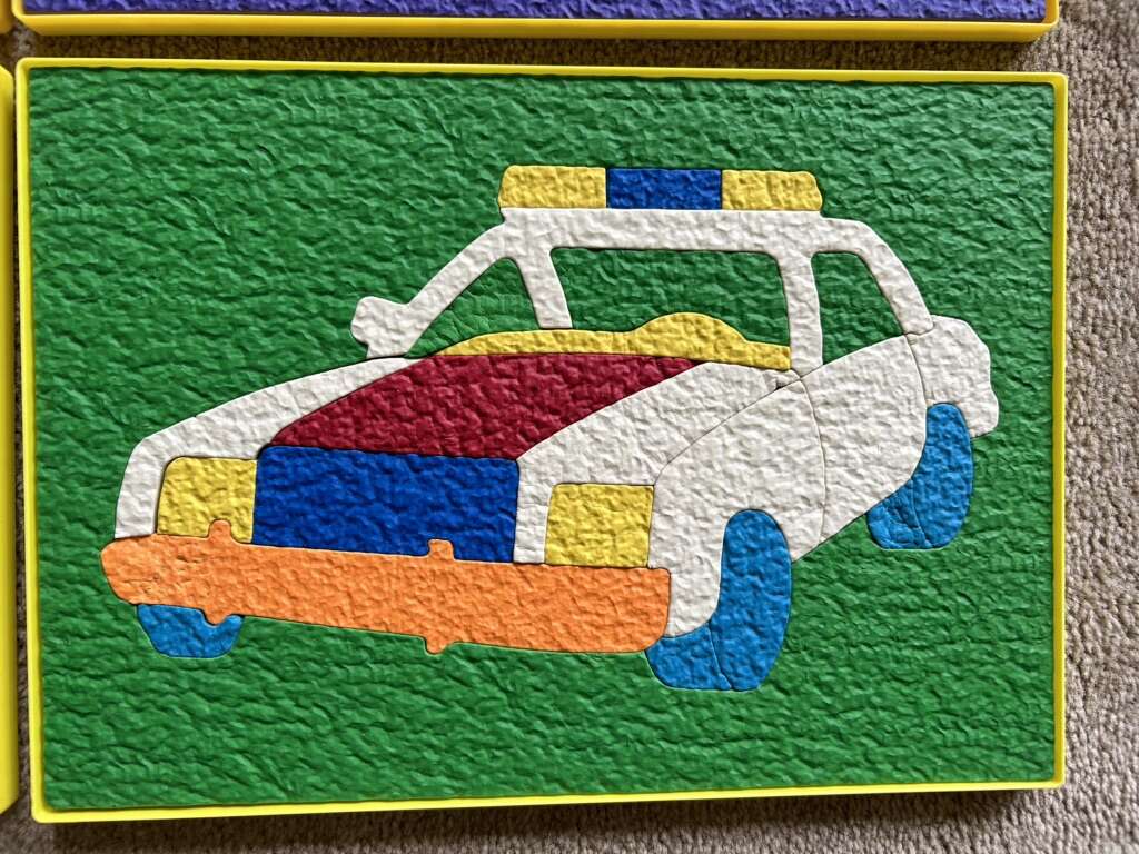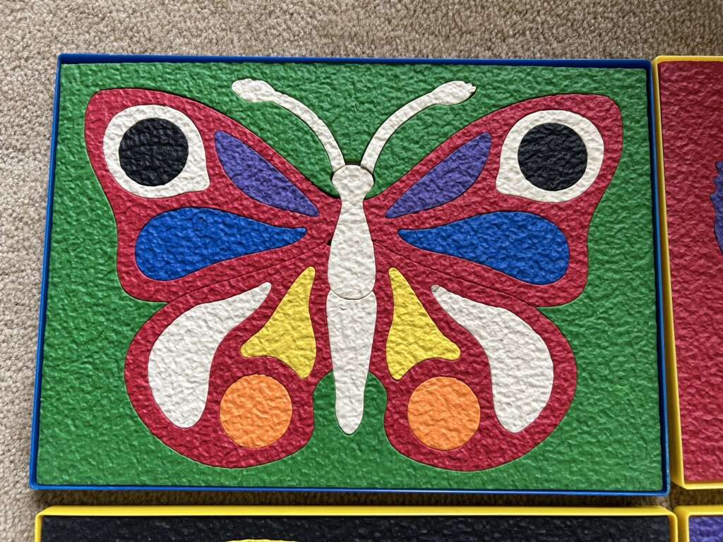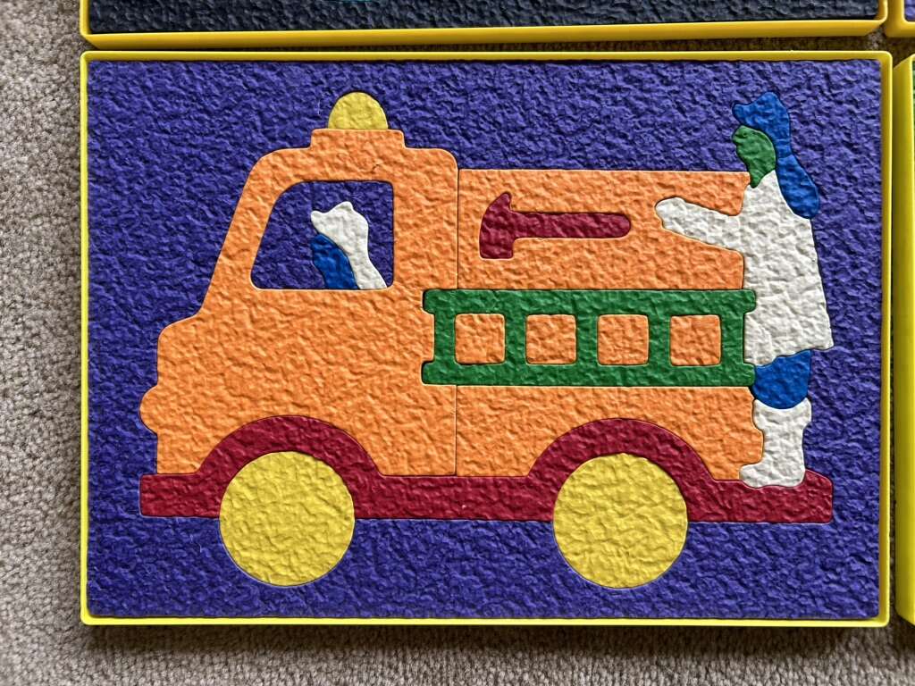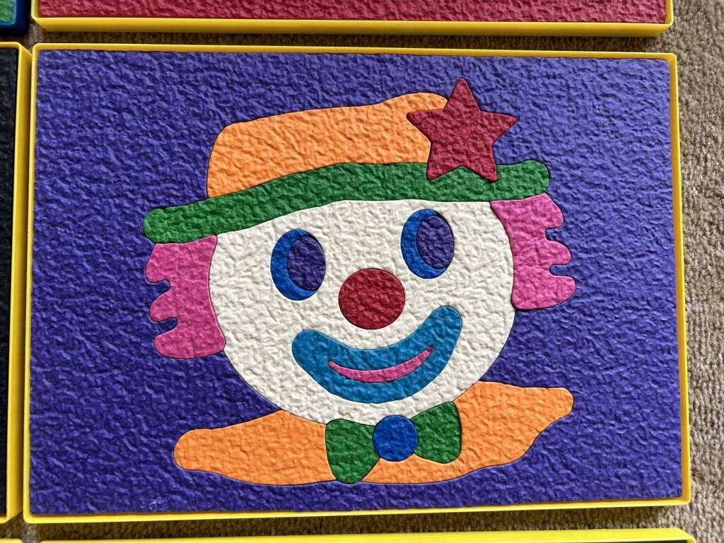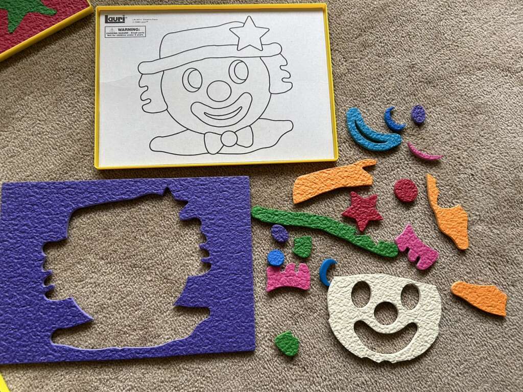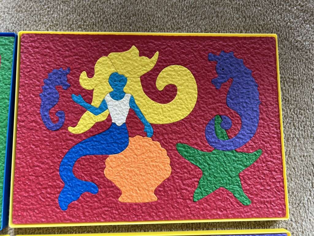 Six Lauri Brand Puzzles—high-quality puzzles made of crepe rubber/foam, in a sturdy plastic tray with a cardboard guide. Butterfly, Mermaid, Helicopter, Clown, Fire Engine, and Police Car. All in very good condition. No missing pieces. A couple of pieces slightly scrunched. Text only. Cash or Venmo.