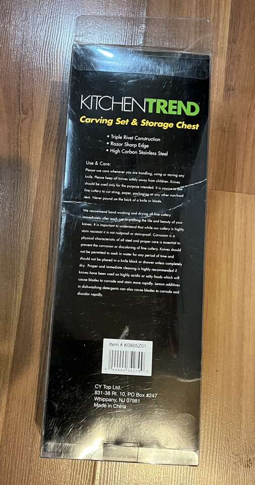 Never opened box of Kitchen Trend Carving set with wood storage chest. Razor sharp edge. High carbon stainless steel. $20