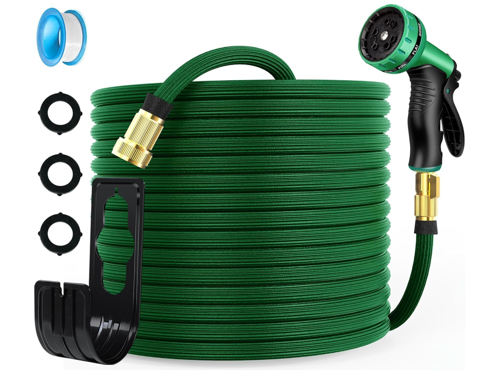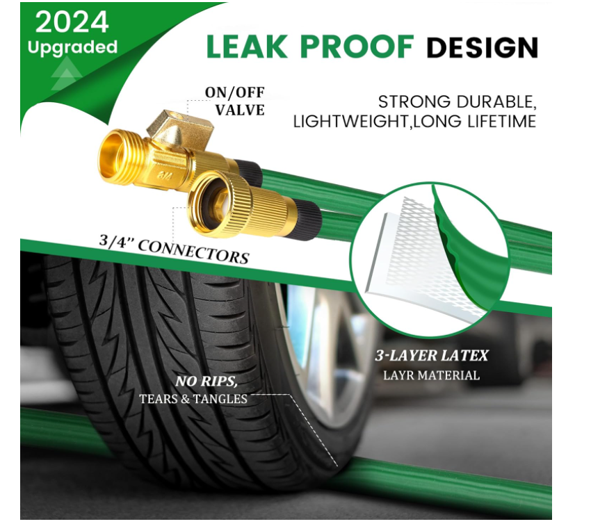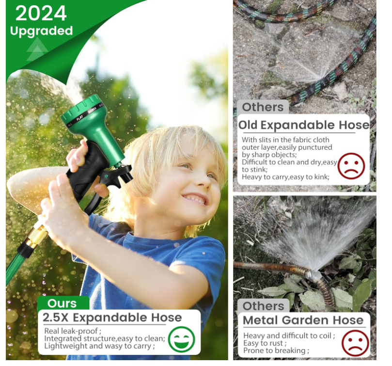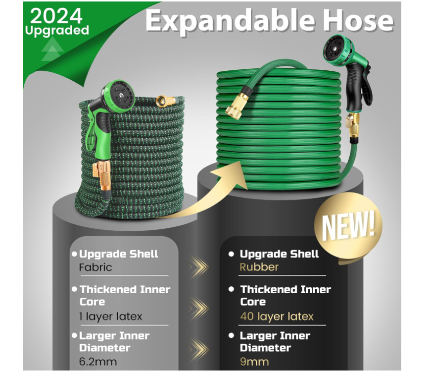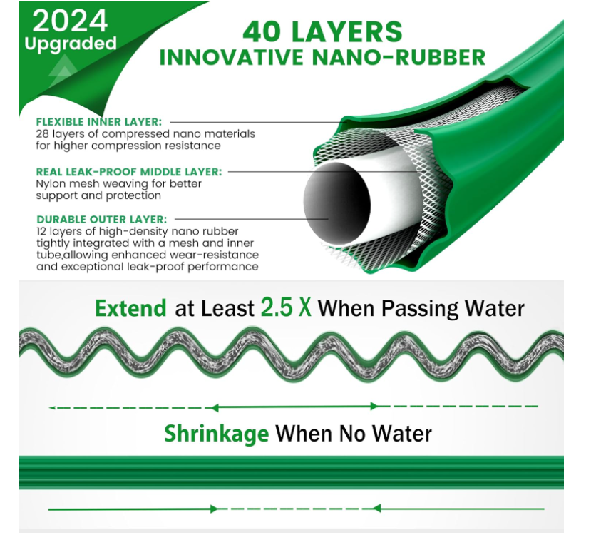 2024 New Patented Innovative MaterialsThe inner layer of the expandable garden hose with multi-layer integrated structure technology utilizes high-density natural rubber and polyester woven fiber yarn,providing exceptional elasticity and deformation resistance.Its outer layer is crafted from advanced nano-materials, is not only abrasion-resistant but also aging-resistant, ensuring easy cleaning and quick drying.Say goodbye to damage and leakage– this hose is built to last for years.