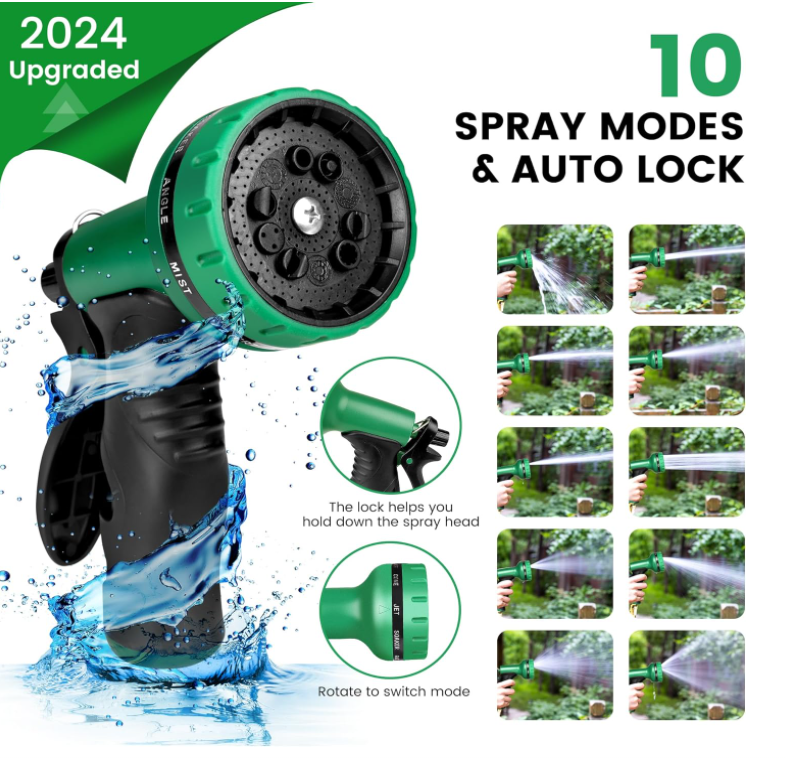 10 Adjustable Spray ModesRotating flaps allow you to choose from a variety of different watering modes to control everything from a soft and delicate shower all the way to high-speed jets. The ergonomic rubber handle, non-slip and easy to handle, makes our water hose 100ft easy for both adults and children to use.You can easily tackle a variety of watering and cleaning tasks,such as watering crops and flowers during different stages of growth,cleaning cars,floors,swimming pools,windows...