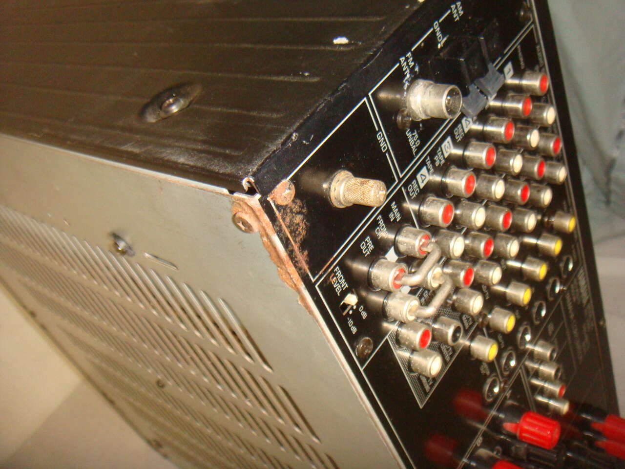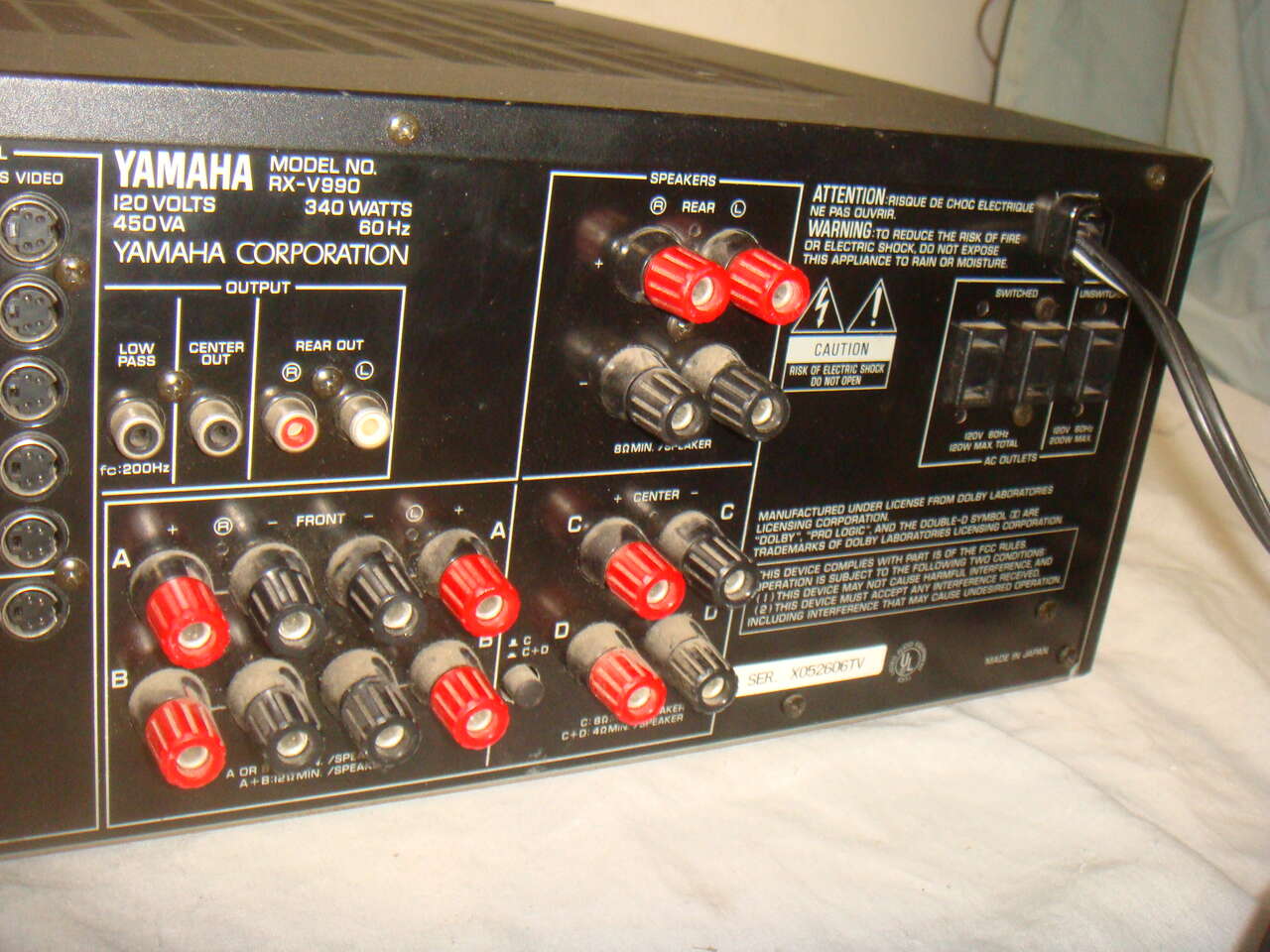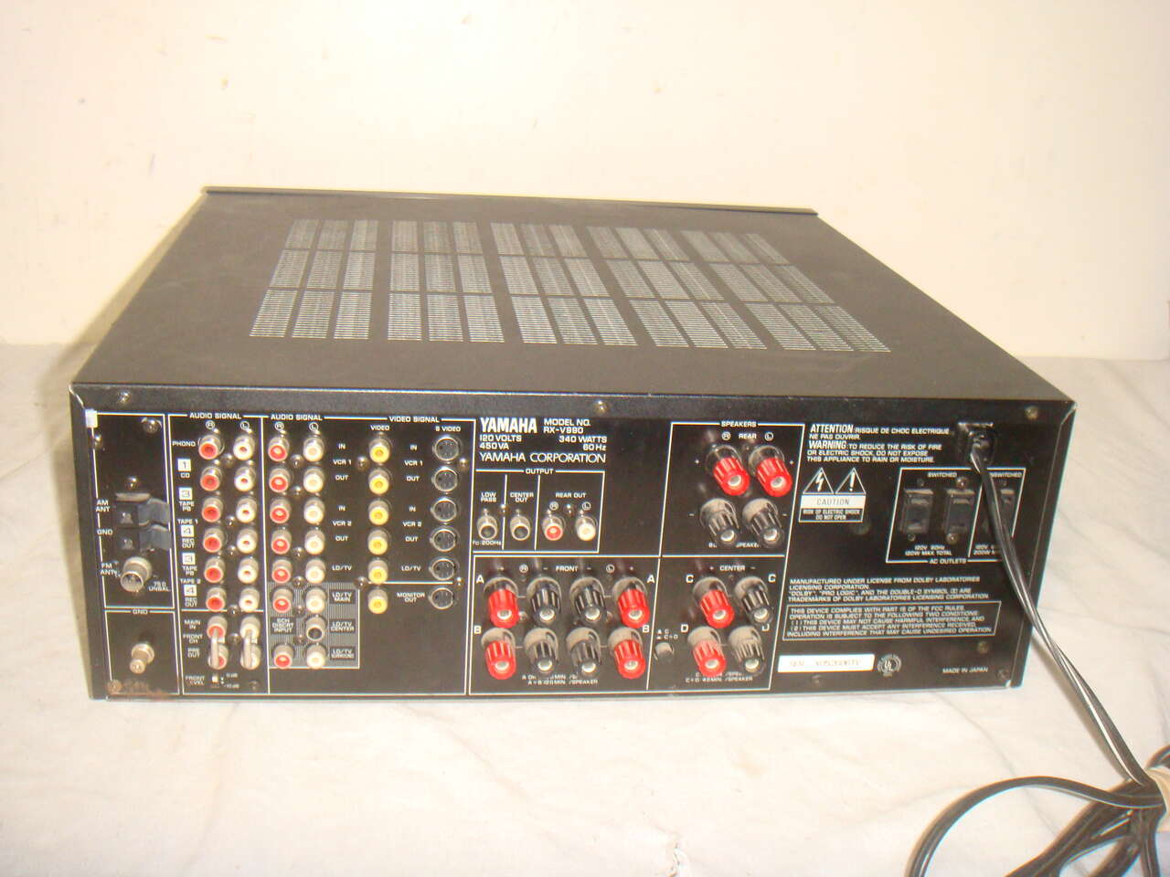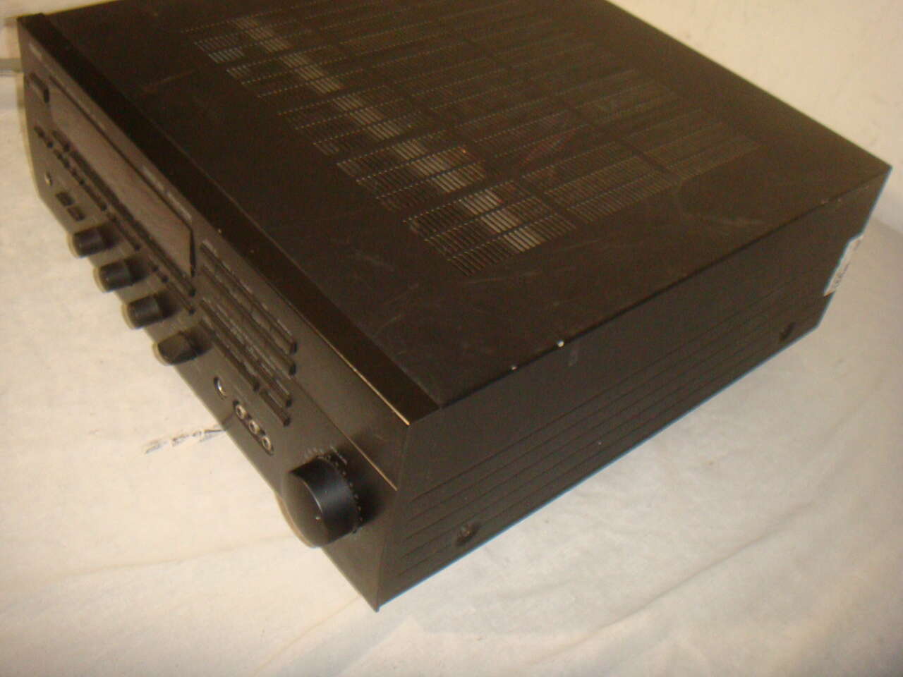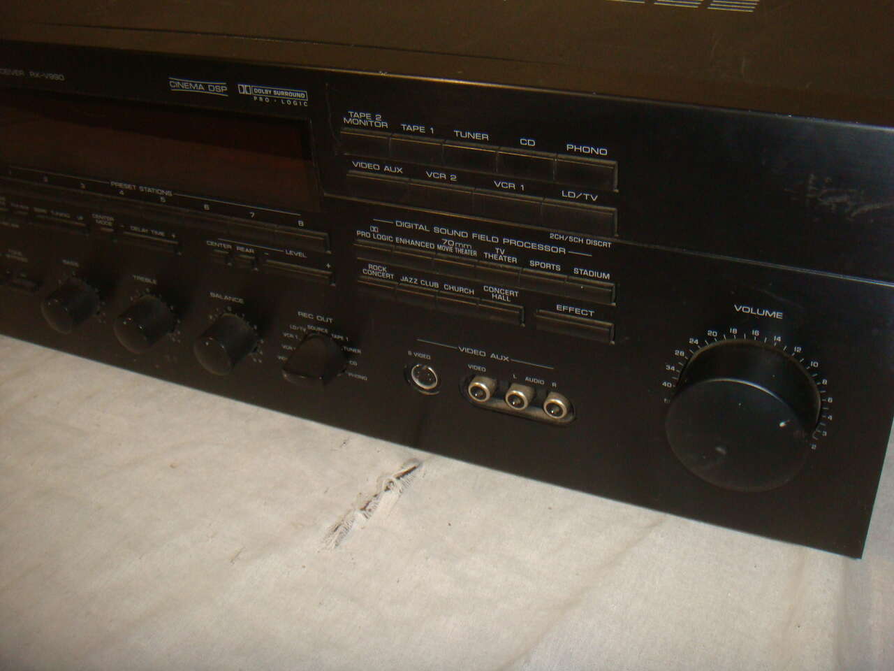 YAMAHA RX-V990 NATURAL SOUND AV STEREO & SURROUND SOUND RECEIVER. This is a used receiver that powers up and works great. It has surface marks and signs of use and is missing one of the puck feet on the bottom and one of the others is broken and detached. One could remove the other two, or just buy a couple of replacements. There is a tiny bit of oxidation on one of the corners. It is the receiver only without any remote or other accessories. It has been tested and works and sounds great!! We'll show everything in the photos below. It comes with everything shown. This is your chance to save big-time so don't miss out!!