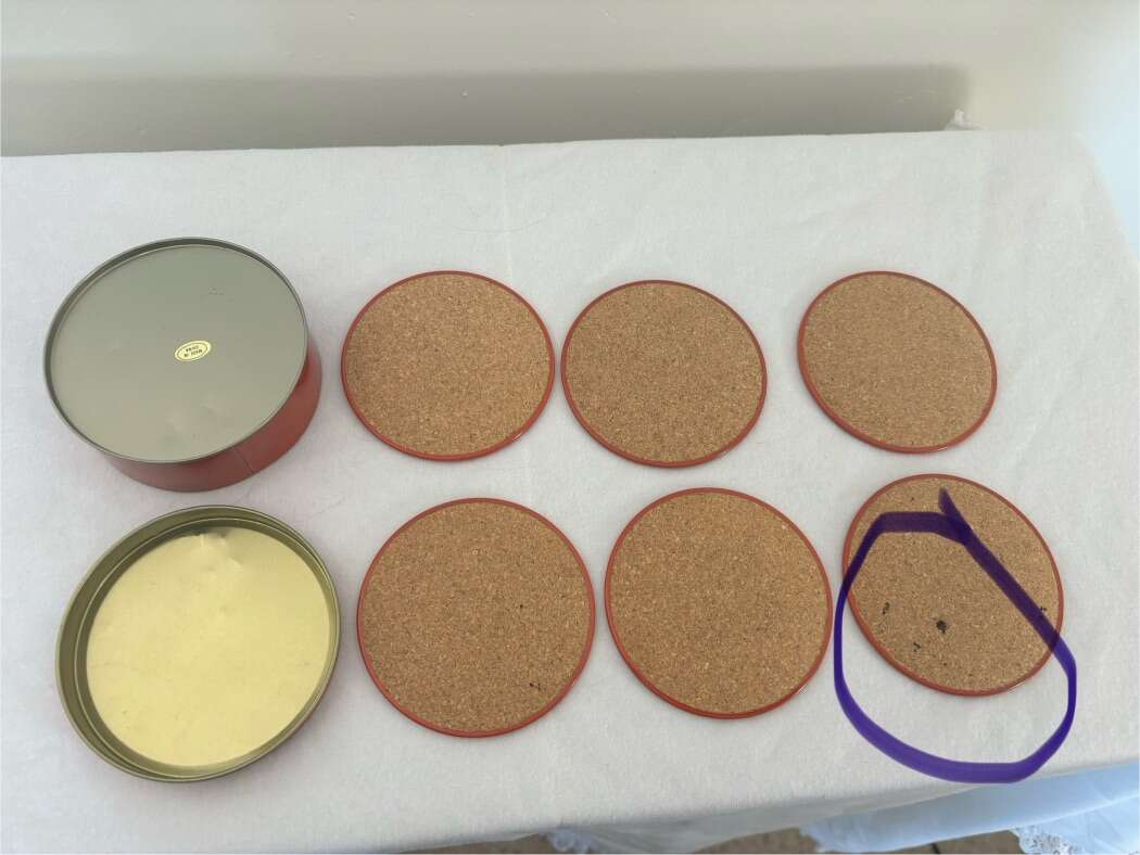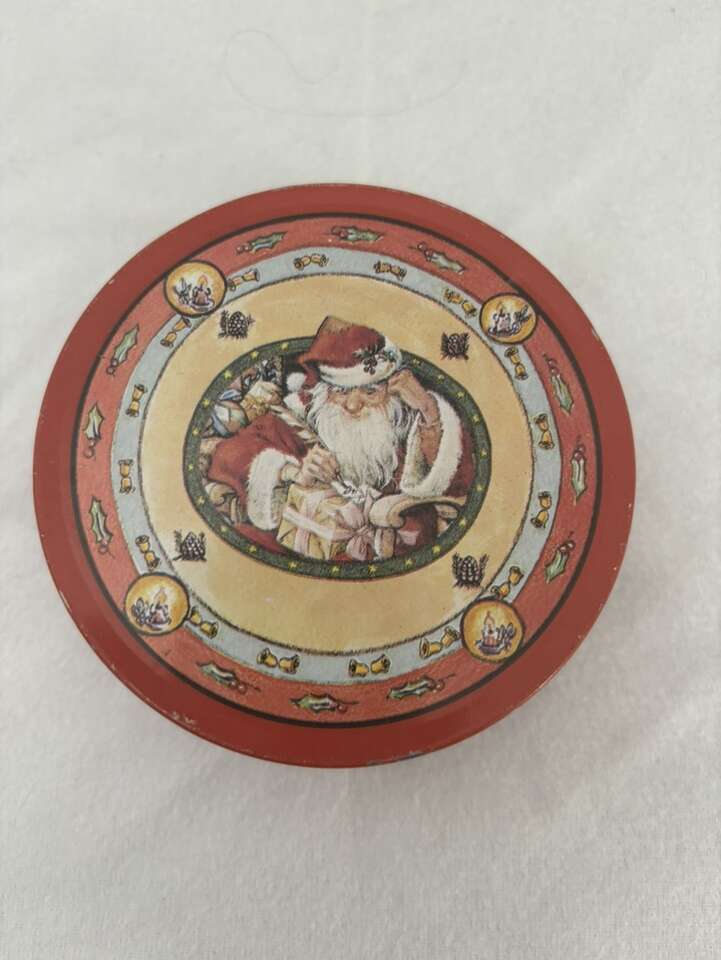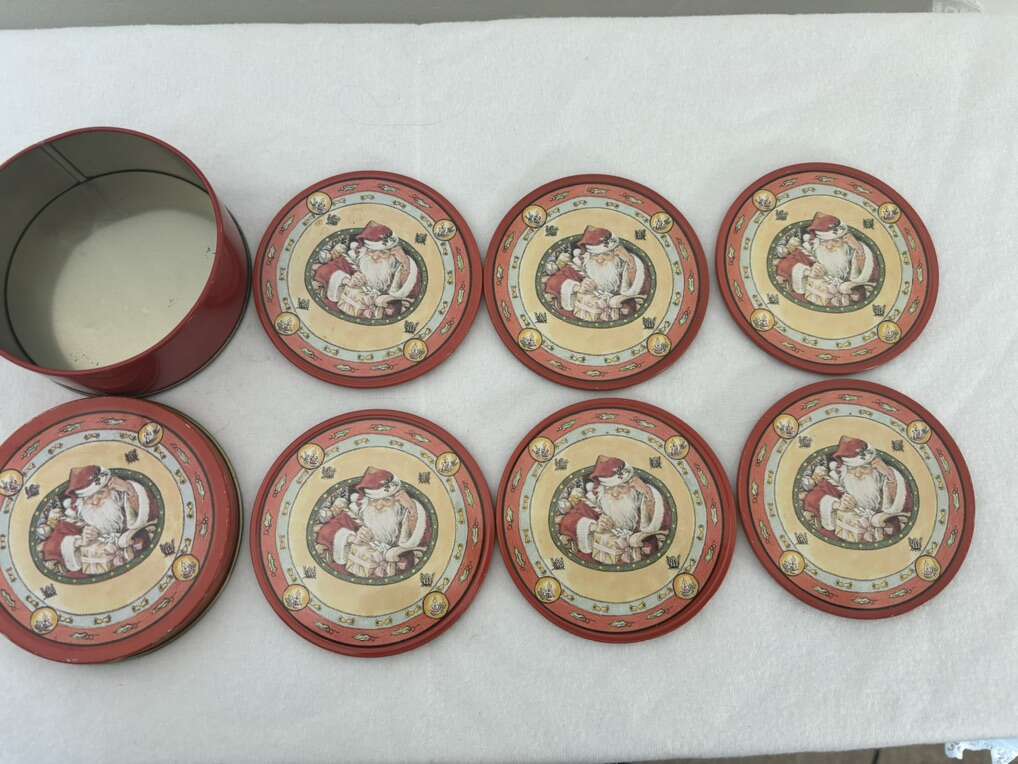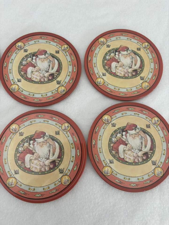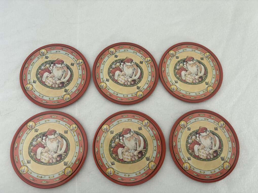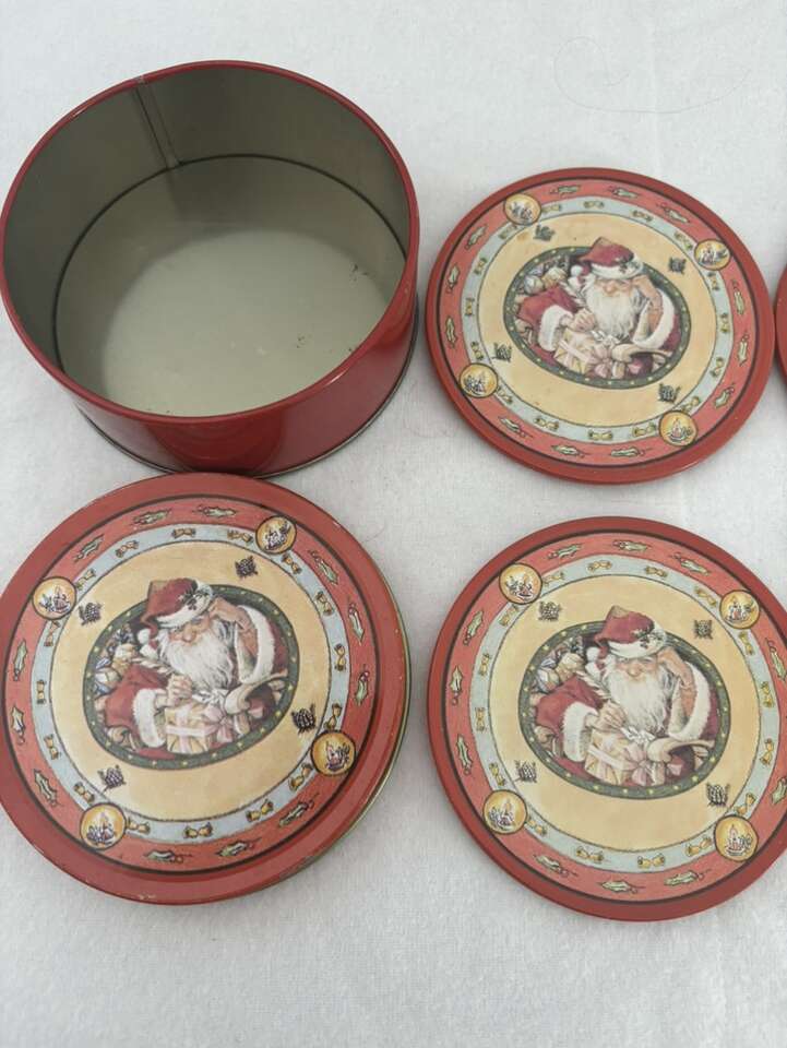 VenmoSet of 6 Vintage Santa Tin Coaster Vintage Tin Of Santa Coasters. Tin contains 6 coasters. Tin on top and cork on bottom. Approximately 3 1/2” in diameter