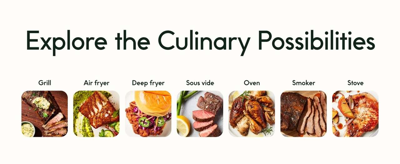 The two highly accurate sensors in each probe track the internal temperature of your food, as well as the ambient temperature of the grill or oven within 1˚F. The tip of the probe has a max temperature of 225°F, and should be inserted fully into the cooking food to avoid damaging the internal components, while the base of the thermometer probe is heat-resistant up to 572°F. Each probe has over 20-hours of use time. Do not touch probes with bare hands during or after cooking, they need time to cool! The app also has a growing library of delicious recipes with step-by-step instructions, videos, and detailed directions to guarantee success every time.