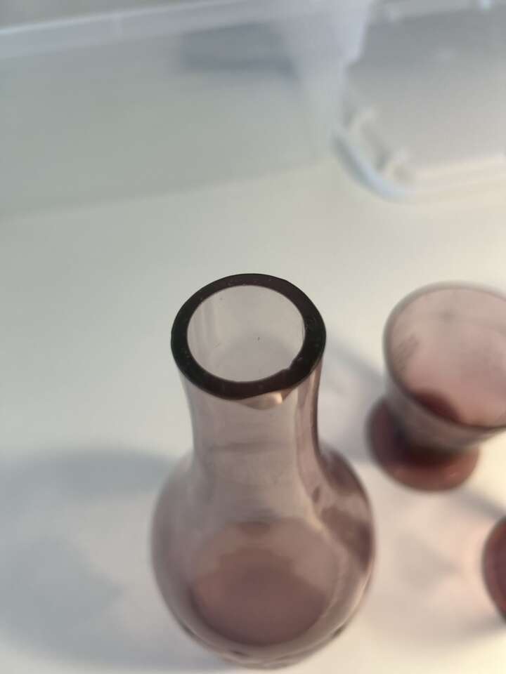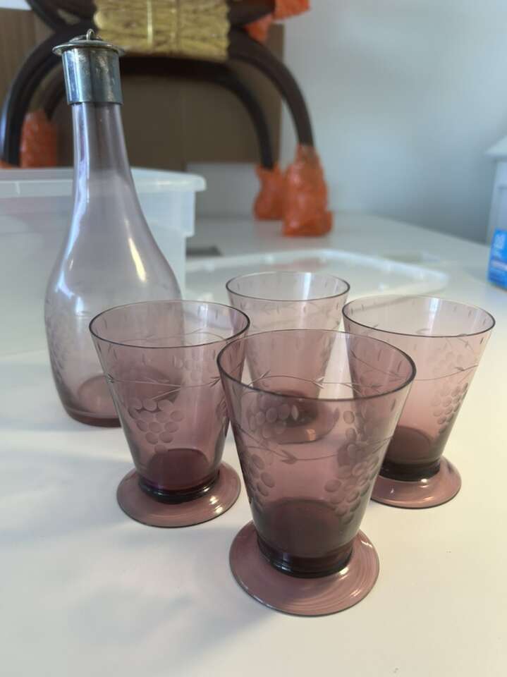 ZelleThis vintage Pottery Barn bar set features a beautiful grape pattern decanter made of elegant glass. The set includes purple glass cups and is from the late 20th century, specifically manufactured in 1970. The decanter measures 10 inches in height and 4 inches in length and width, while each cup weighs 2 lbs.
