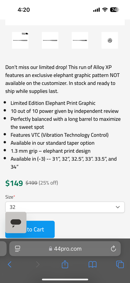 ApplePayBrand new Limited Edition Elephant Allow XP BBCOR Baseball Bat 32" (-3). I've pasted a link below to 44pro.com to view all the details about this bat. Let me know if you have any questions.