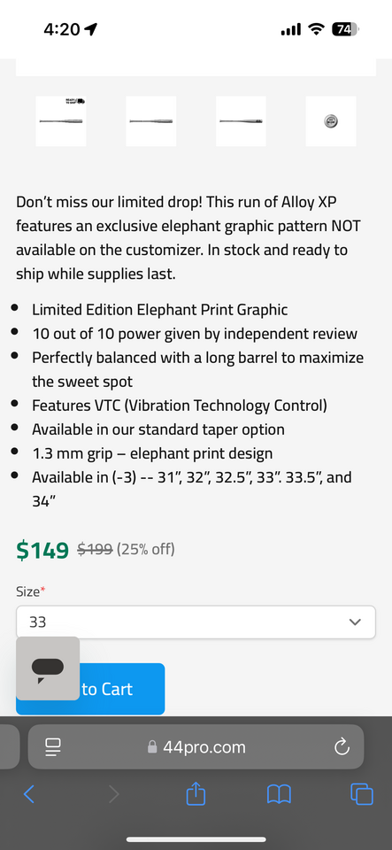 ApplePayBrand new Limited Edition Elephant Allow XP BBCOR Baseball Bat 33" (-3). I've pasted a link below to 44pro.com to view all the details about this bat. Let me know if you have any questions.