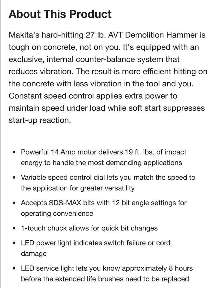 Description- 14 Amp, 27 Lb. AVT electric 120 V demolition hammer with case and bit. See photos for more product information and specifications.