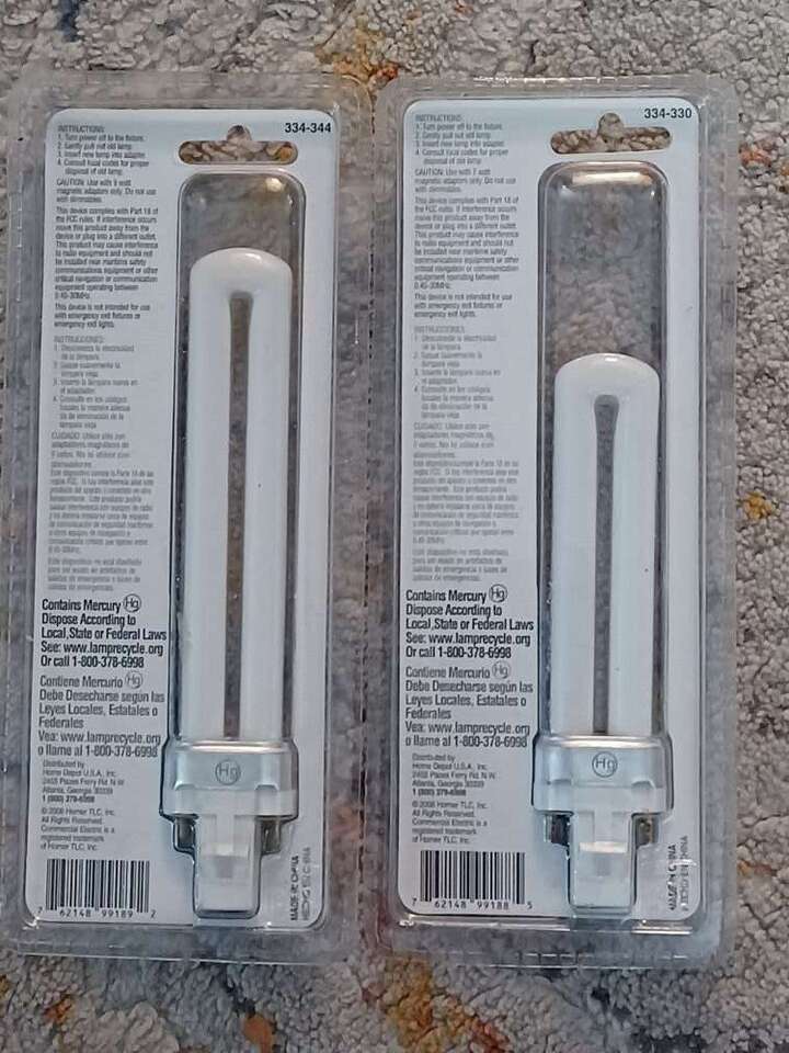 Commercial Electric Compact Flourescent Bulbs 7 watt is 400 Lumens of light output. 9 Watt is 600 Lemuns of light output. 2 pin design. Price listed is for both bulbs. FCFS Cash only.