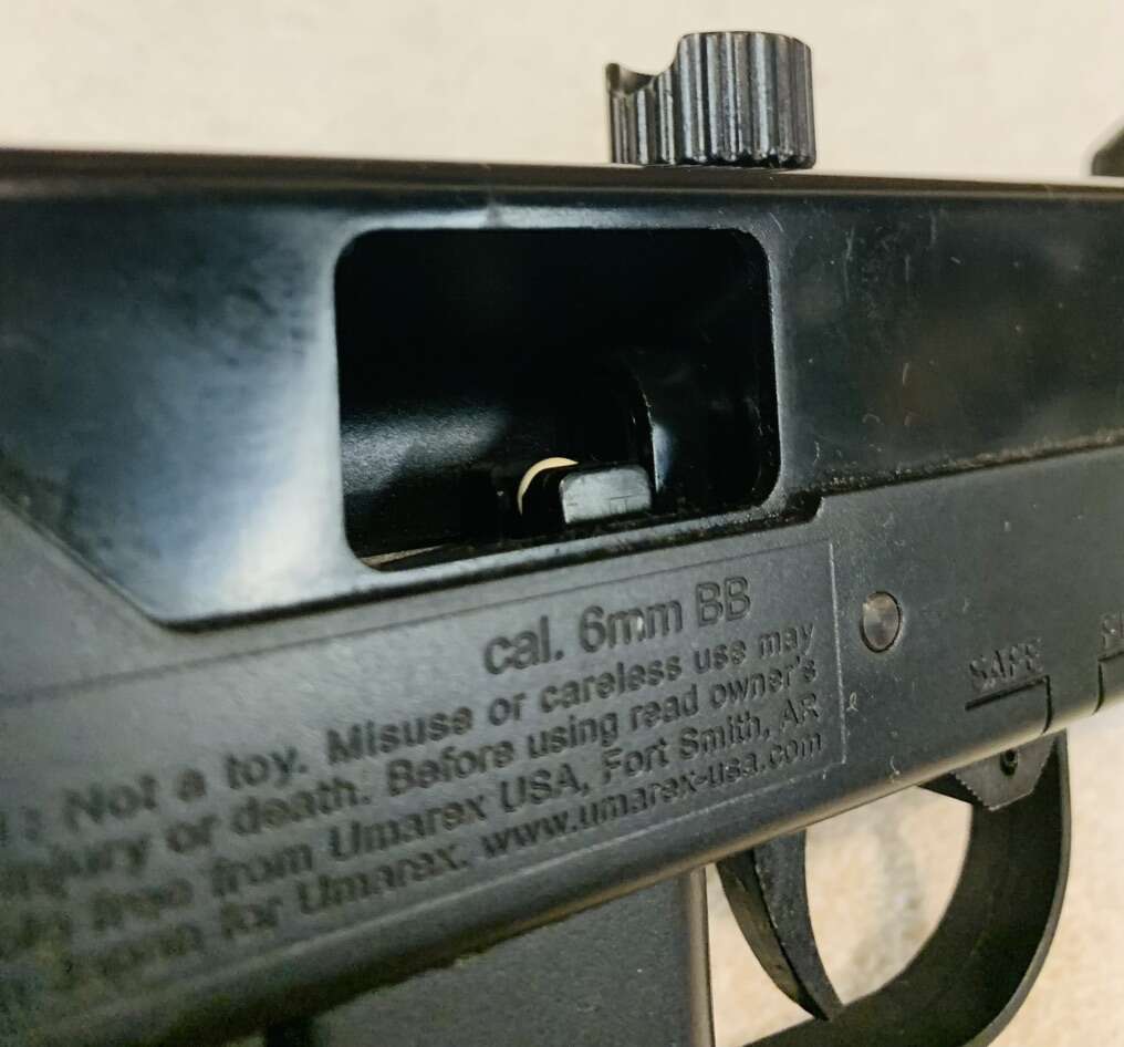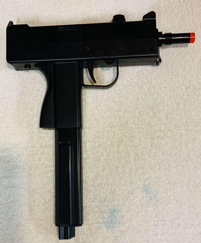 6mm AirSoft Gas Blowback Mini Uzi Pistol. Condition: Extra Good & Fully Functional. Authentic Replica with 6” Extended Barrel. 5 1/2” long Smooth-bore Brass Inner Barrel. Semi & Full Auto with Blowback Action & Felt Recoil. Selector Switch on Receiver Left Side. Manual Safety. Metal & Quality Plastic construction. Guarded Fixed Post Front Sight & Peep Rear. Powered by One 12g CO2 Cylinder housed in 50 Round BB Magazine.