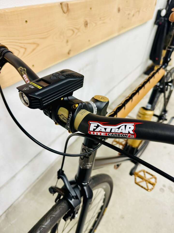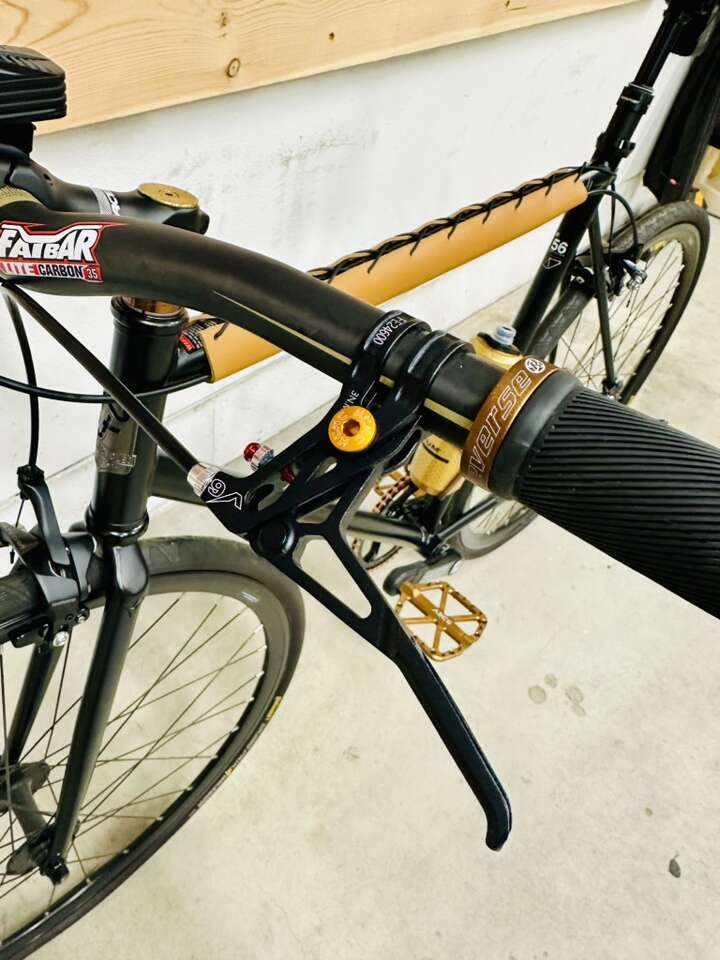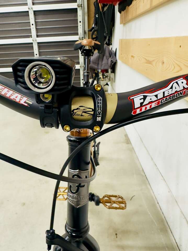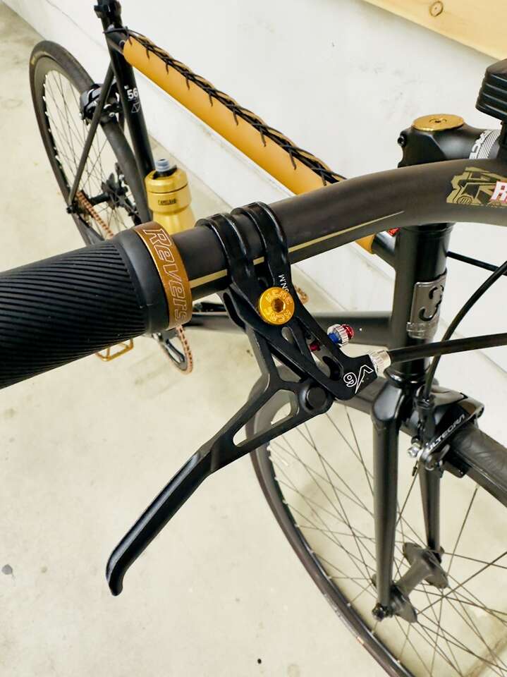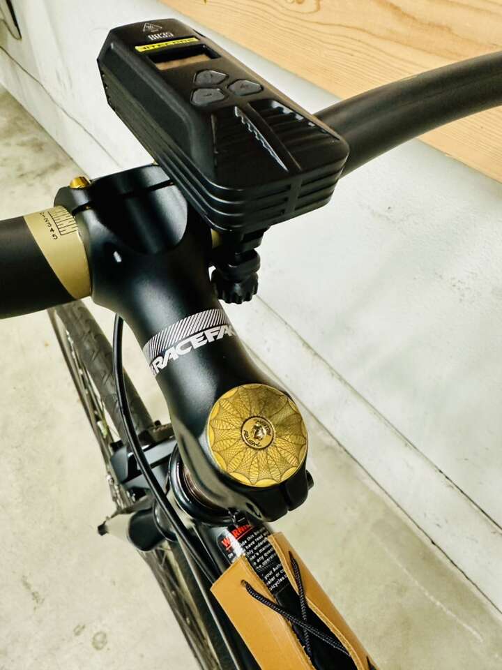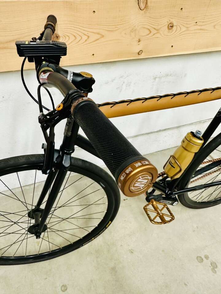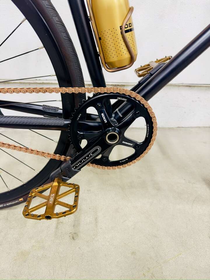 -KCNC V6 brake levers -SRAM Omnium crankset -Nightcore BR35 1800 lumens headlight -BV aluminum alloy lightweight kickstand -Renthal Fatbar Lite Carbon 35mm bars -Shadow Conspiracy V2 copper chain -Burgtec Kash bronze headset spacers -Raceface ride MTB stem with gold titanium bolts -Continental Season 4 road tires -Silca bronze Titanium water bottle cage -SDG Radar Lux-Alloy brown Sensus saddle -Lizard skins carbon leather chainstay protector -Magicshine 300 lumen taillight/brakelight -5DEV Kash bronze pedals