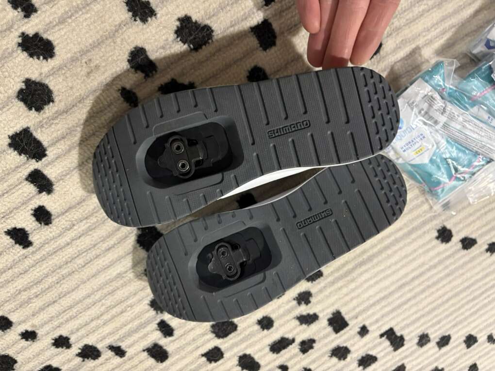 White Shimano stationary biking shoes, boa system, Got these for wife, she is a size 6.6-7 the shoe says 5.5, not sure if that’s a men’s size or what, maybe used 2-3 times